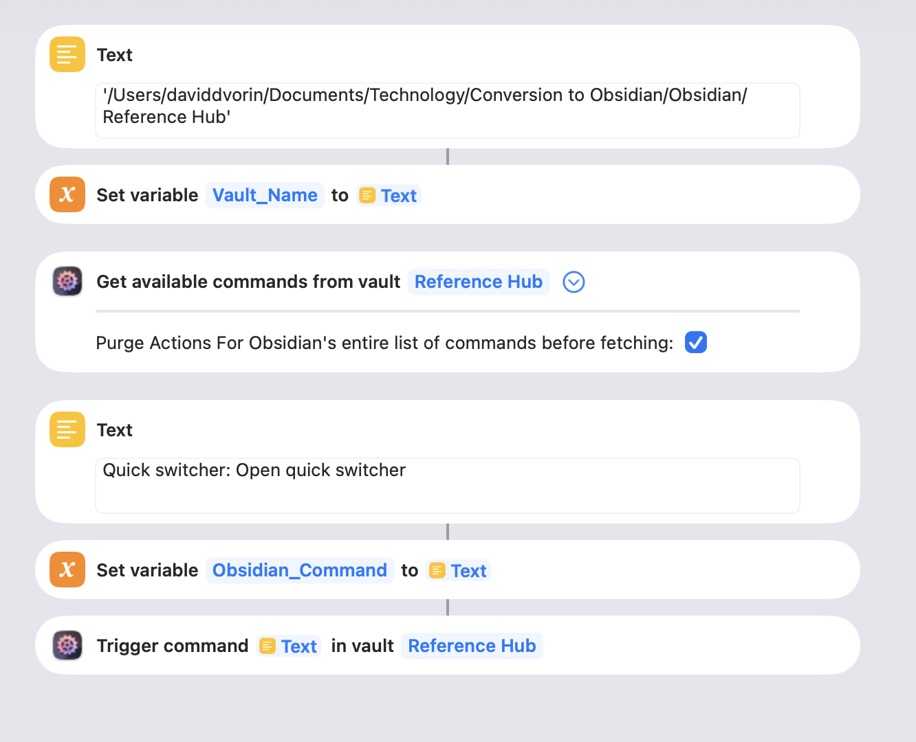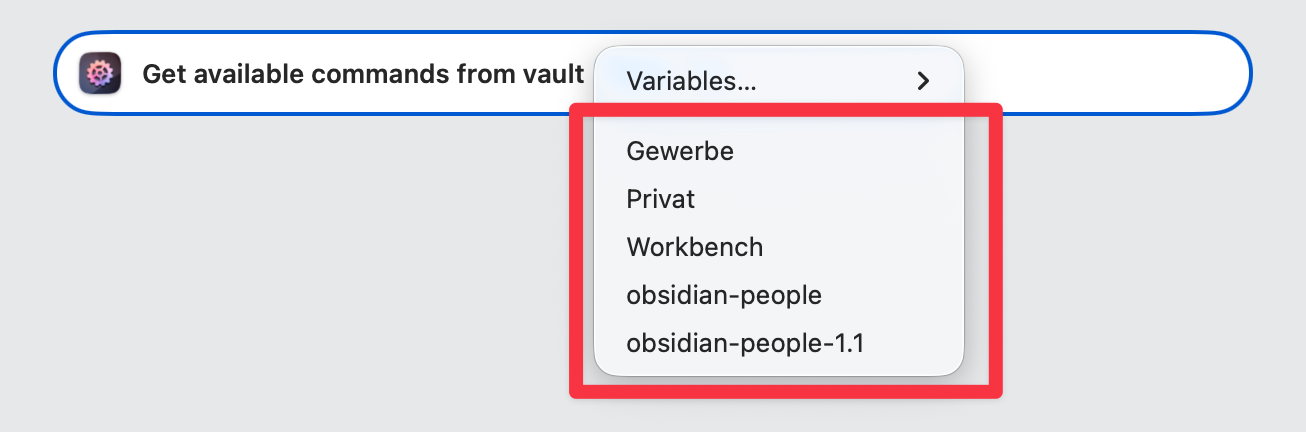 Also, when you put both Get Available Commands and Trigger Command in the same workflow, then AFO makes one call to Obsidian to get the commands, and another to trigger a command, and it’ll do so every time. That’s why I said you need two different workflows, i.e. two different shortcuts “programs”, not just one. Fetching the list of commands every time is unnecessary, it’s usually enough to refresh AFO’s internal list of commands after you’ve added or removed plugins in Obsidian, or when there was a major new release that brought new commands.