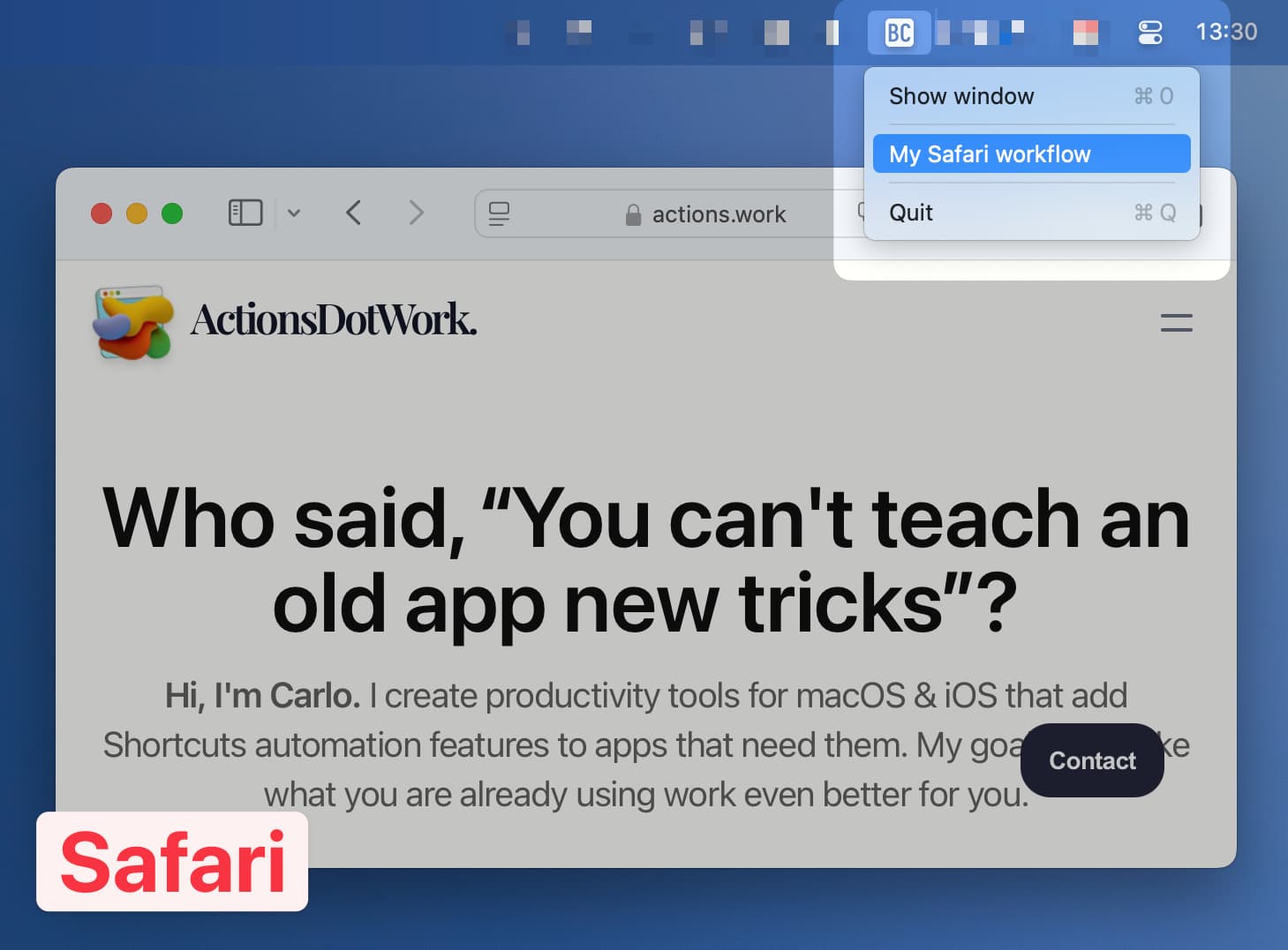 Now, when Iâm in Safari, the BarCuts menu bar icon will list âMy Safari workflowâ: