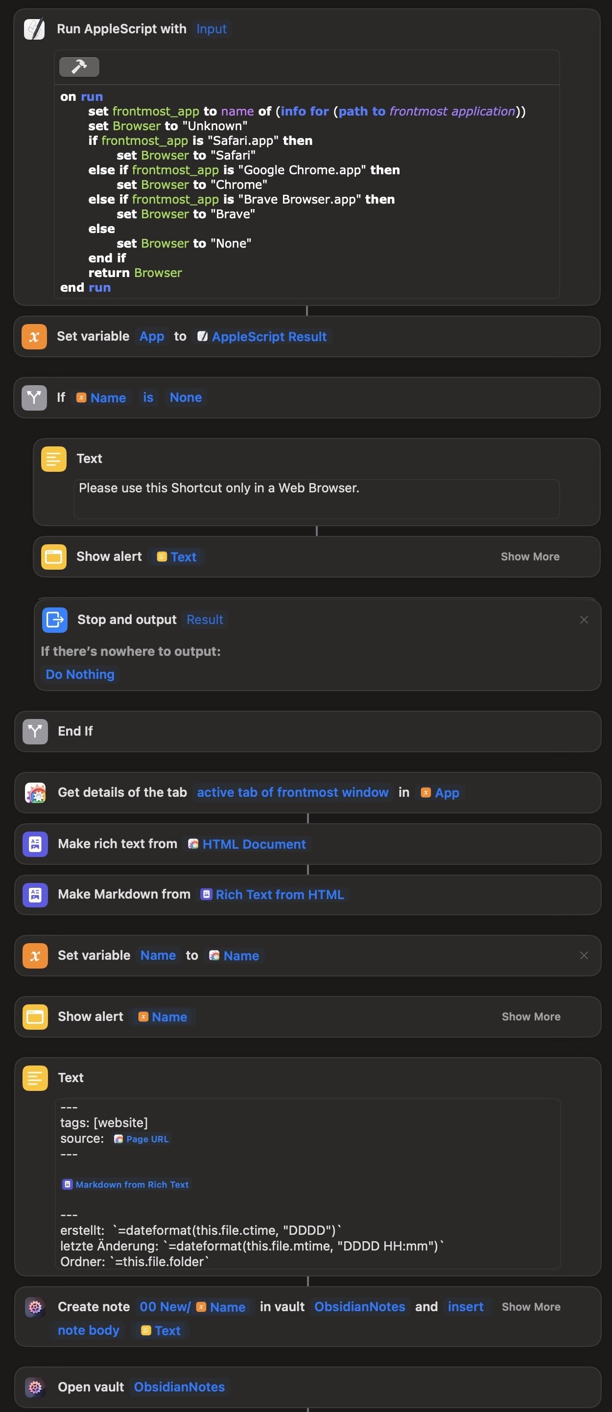 I encountered some challenges with the user interface of the Shortcuts app. Sometimes the editor behaves erratically when editing or deleting variables or expressions. I also found the visual layout a bit unwieldy when working with the nested if statements. Consequently, I decided to shift all of this to the AppleScript portion, as I had to use AppleScript anyway to fetch the name of the frontmost app (I couldn’t find anything other that worked on the web). Perhaps there’s a more elegant solution out there, but this was the path I took.