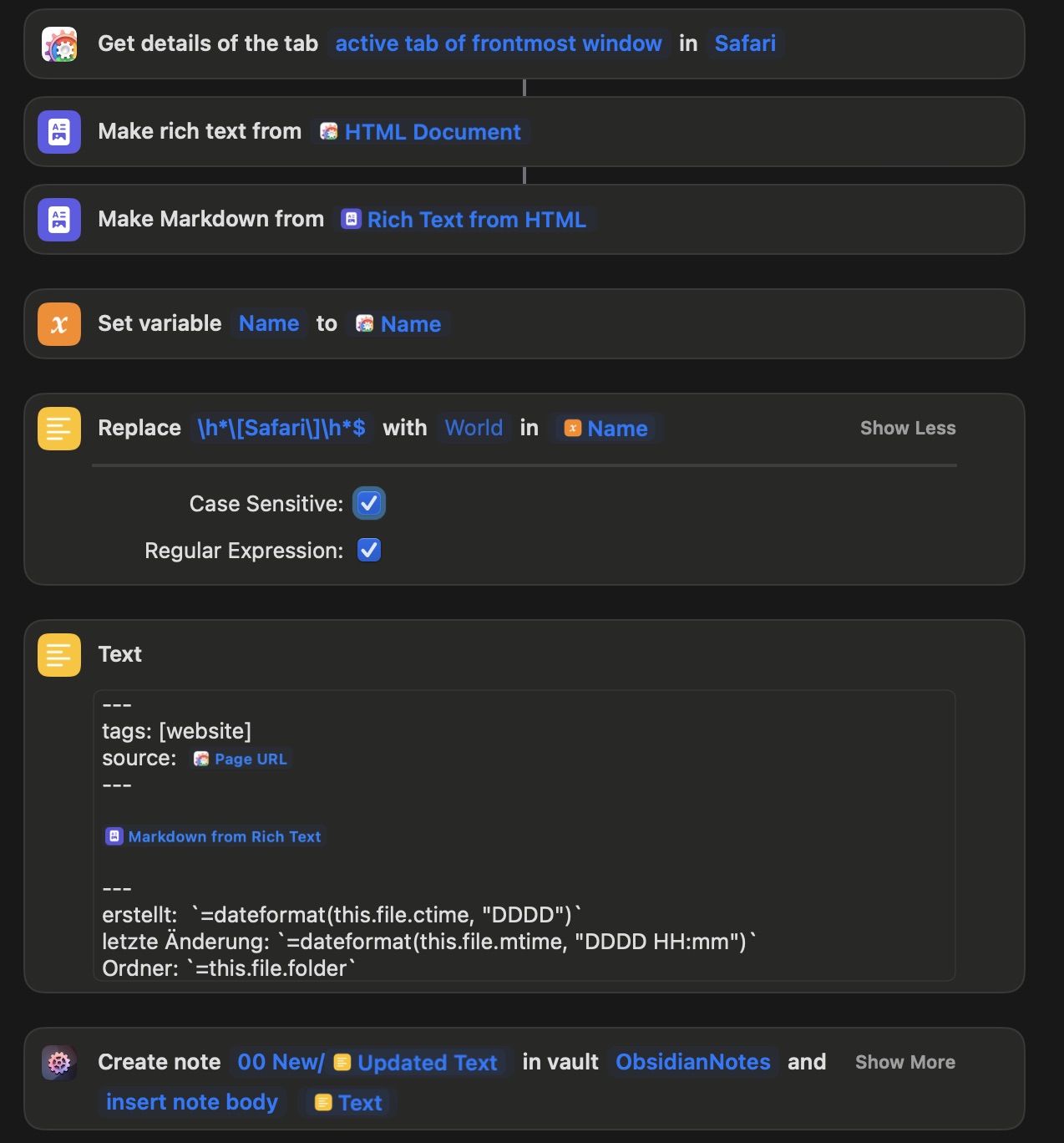 With the “Get details to the tab” function, the browser name is added in square brackets to the webpage’s name. I initially thought this might cause issues when using it in the filename, so I used a regex statement to remove the browser name and brackets. However, I’ve since realized that it’s translated to “- Browsername -”, so I’ve removed that statement.