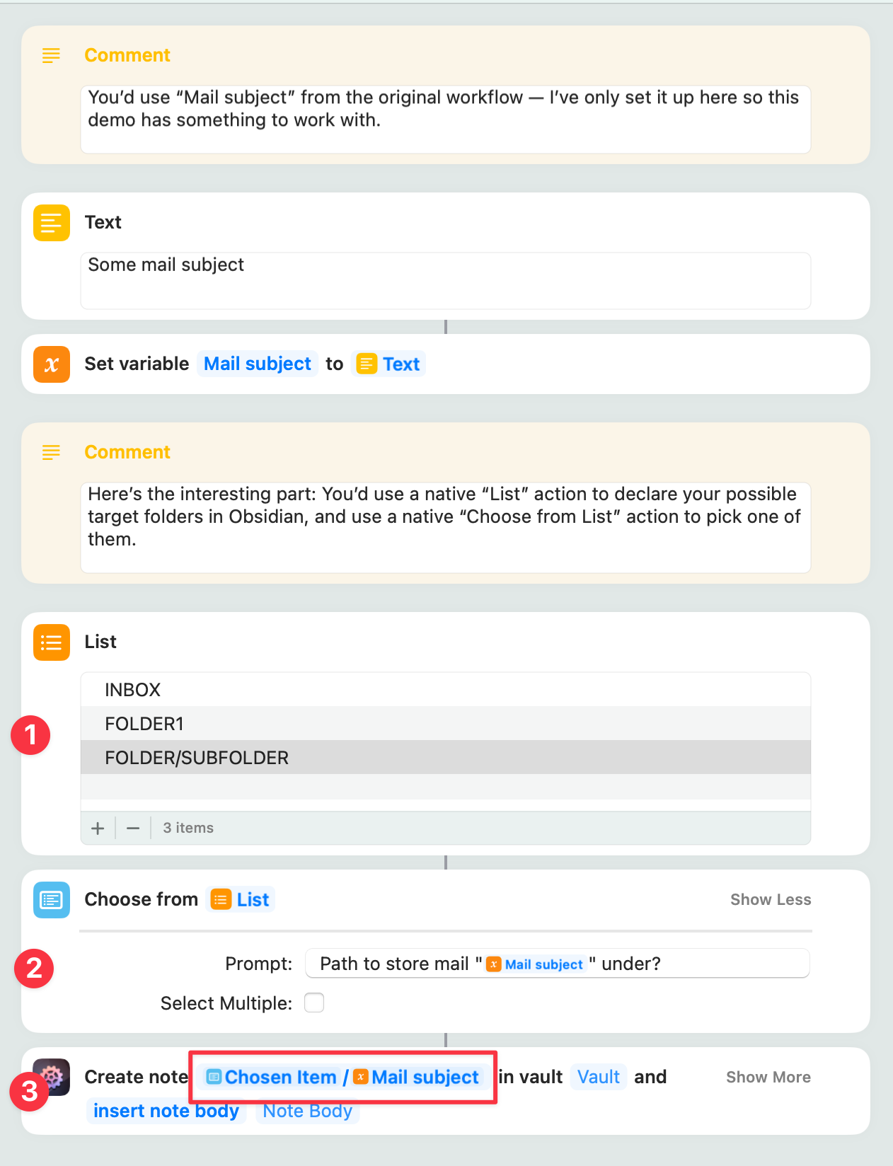 I’m new to shortcuts, but presumably I could have an ‘obsidian folder’ text variable that could be appended to the ‘Mail subject’