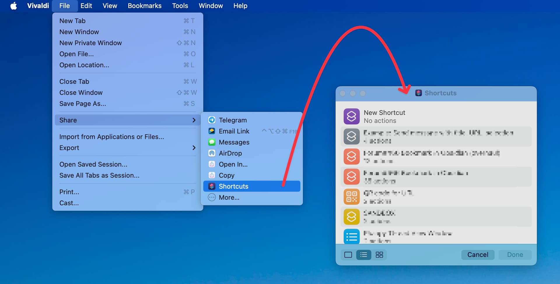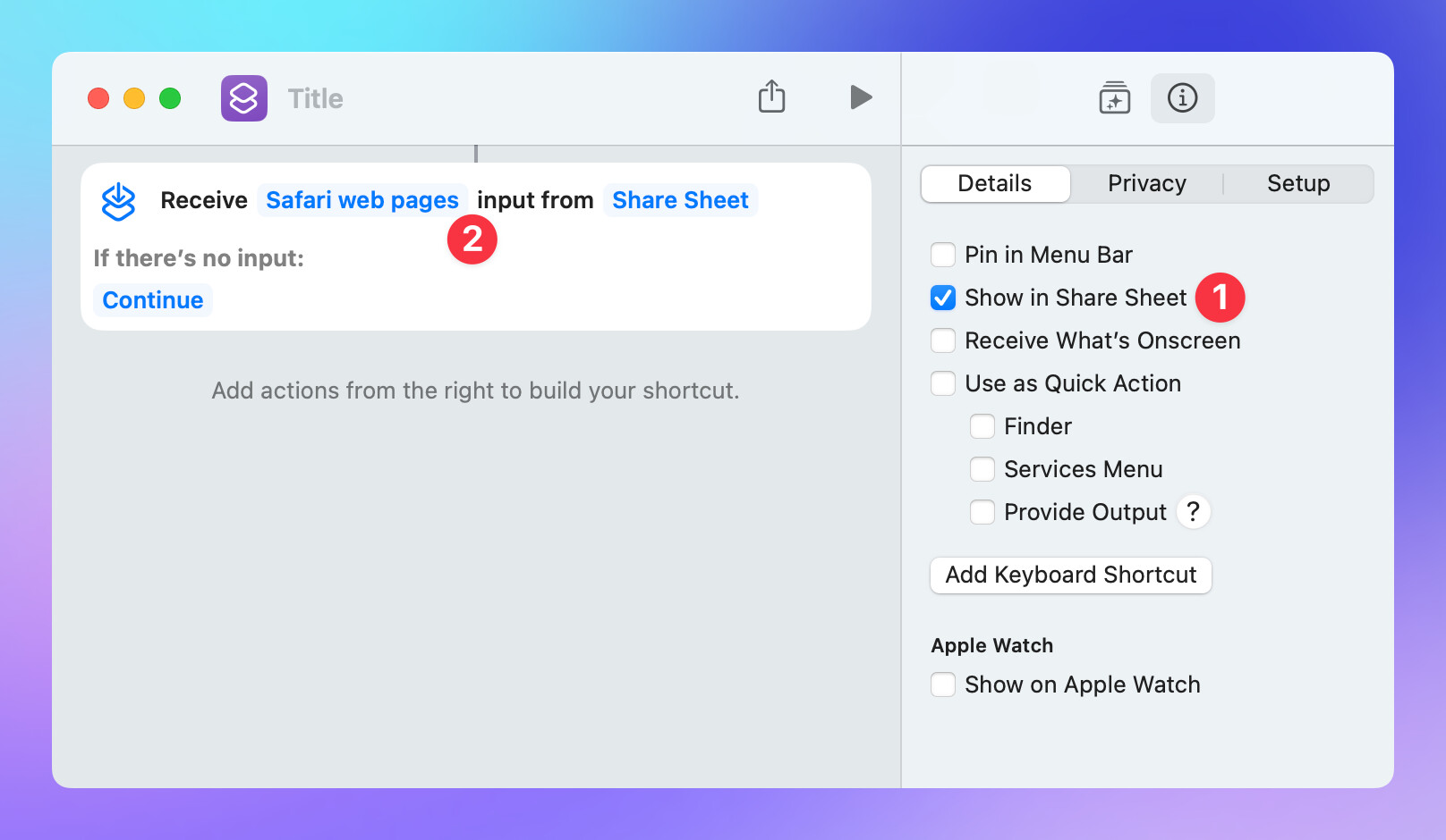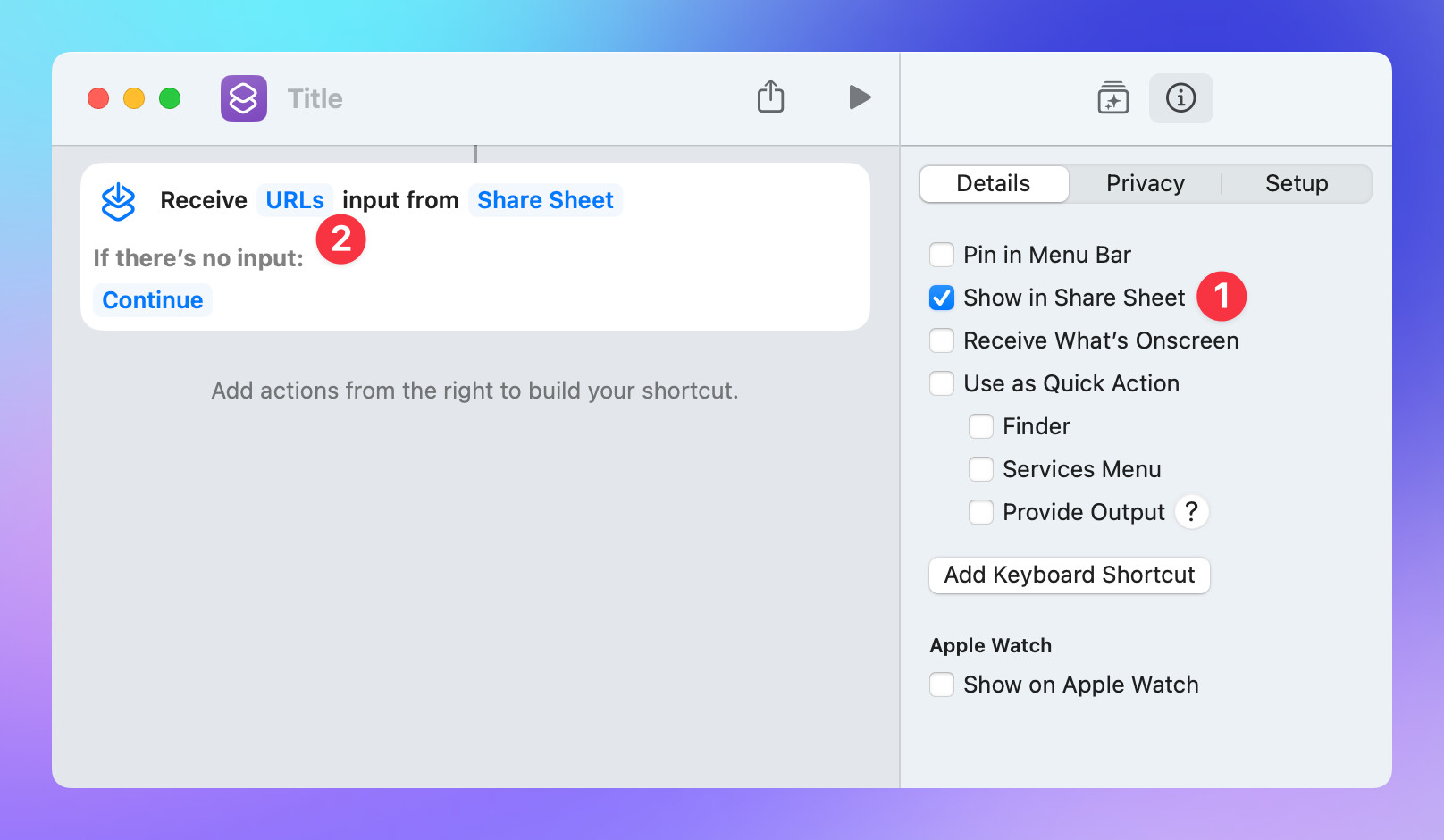 In the Shortcuts editor, if you enable “Show in Share Sheet” (1) for your workflow, and then specify that it accepts input of type “URL” (2), that workflow will be added to your browser’s Share Sheet: