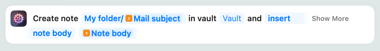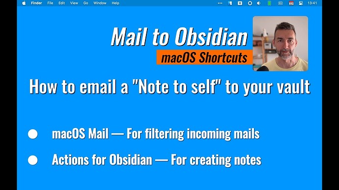 This helper consists of two parts: an AppleScript and a Shortcuts workflow. The AppleScript is a Mail rule that triggers the Shortcuts workflow. The Shortcuts workflow then takes the email and turns it into a note in your Obsidian vault.