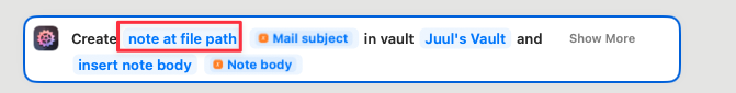 So: click/tap the content of the field (the “Mail subject” variable), clear the field (remove the variable), then type in the folder, followed by “Mail subject”. Shortcuts should recognize you mentioning a named variable, and offer to insert it.