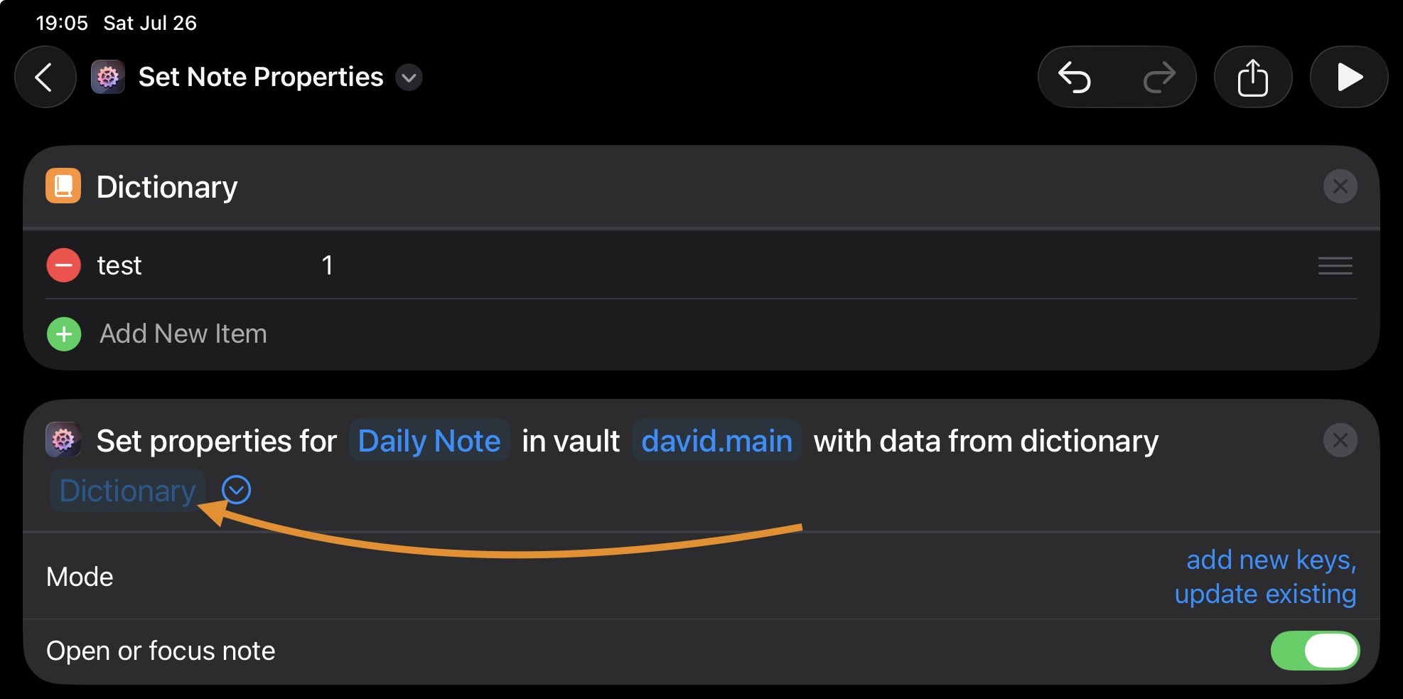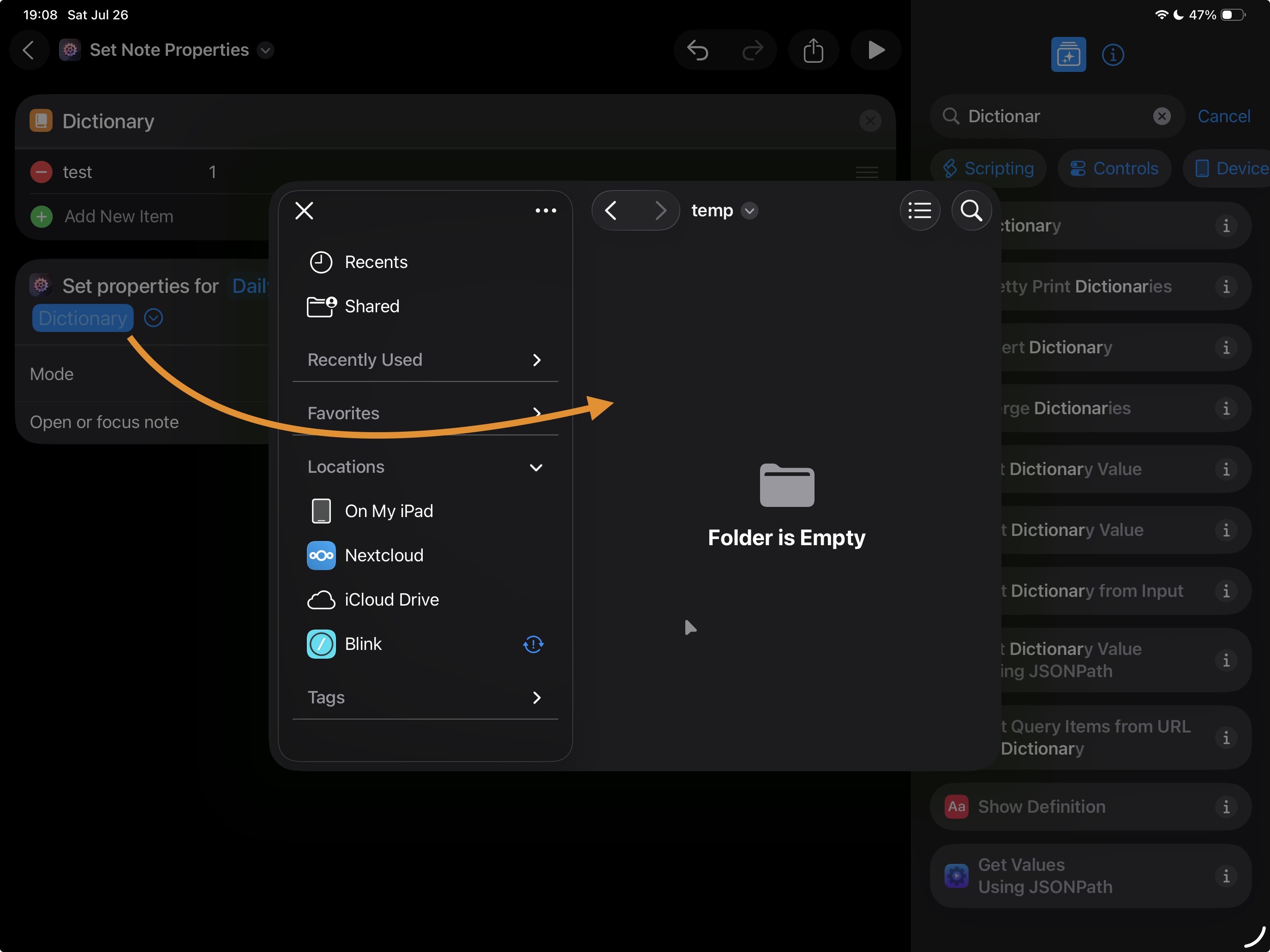 What you’ve discovered is one of (the many) Shortcuts ideosyncracies. Clicking/tapping the “Dictionary” parameter will bring up the file dialog but long-tapping (just like in any other parameter input across Shortcuts) lets you pick any of the existing variables and prior-action results: