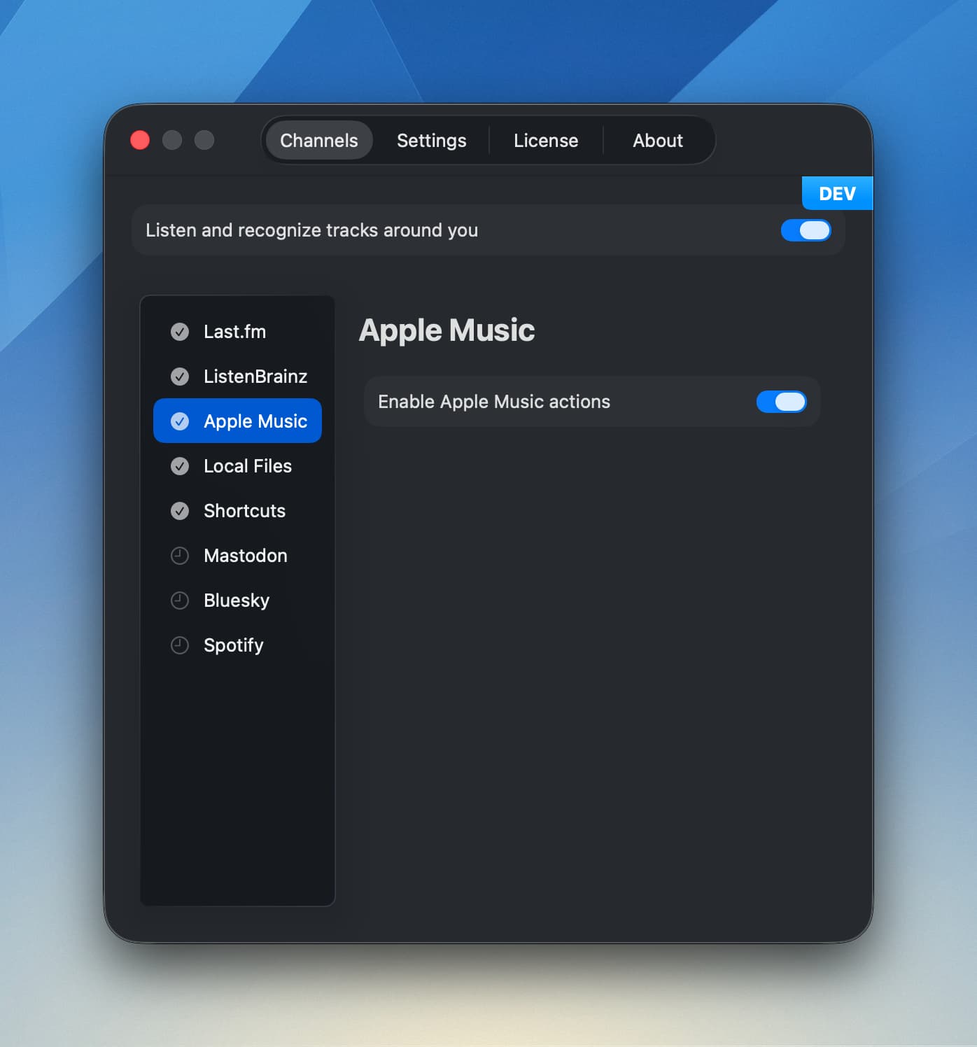 The Apple Music channel adds track menu actions for Apple Music. Unlike other channels, it doesn’t publish or export anything — it just makes it easy to jump to tracks in Apple Music.