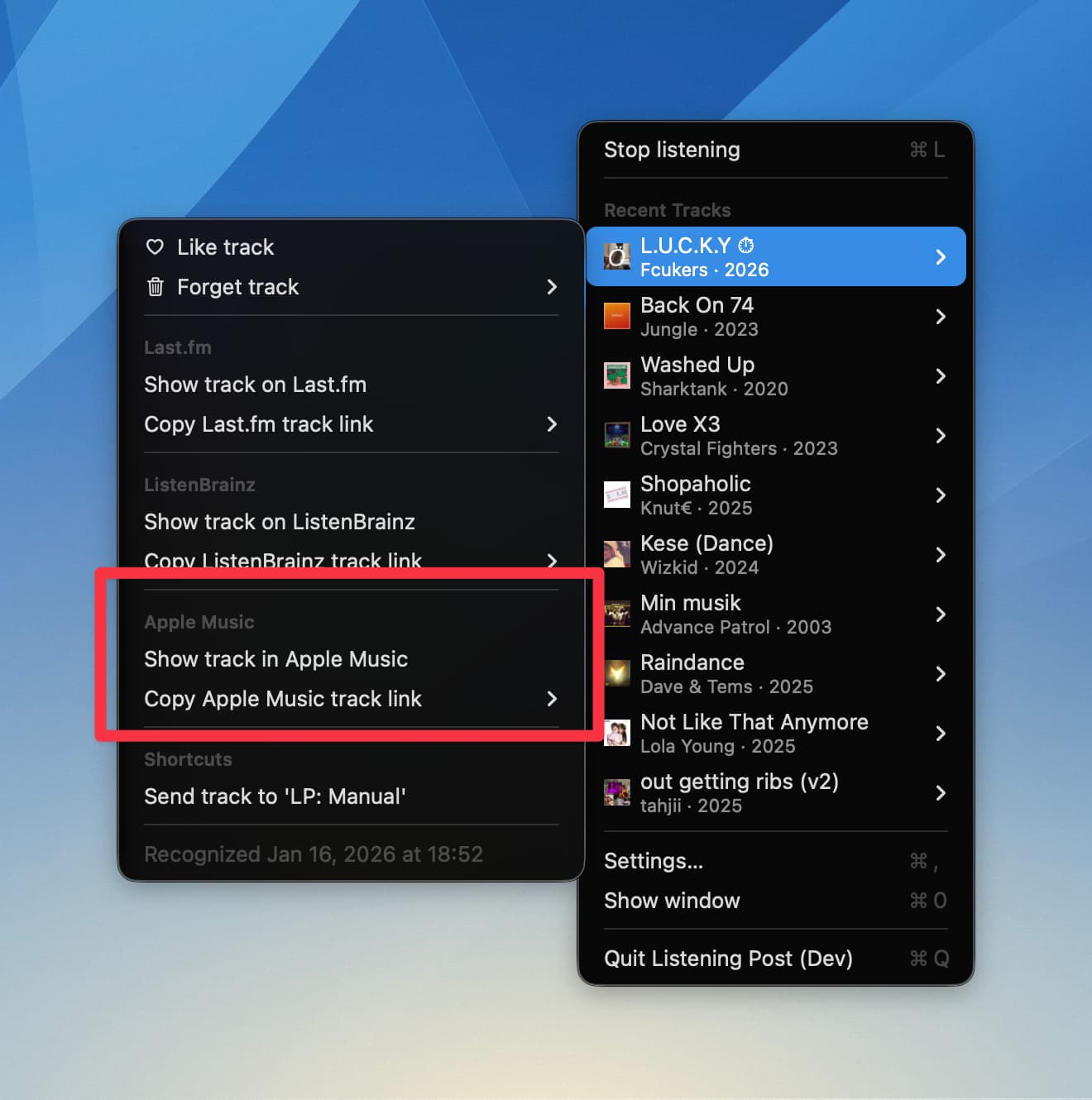 When enabled, recognized tracks get Apple Music actions in their menu (if the track exists in the Apple Music catalog, which most do). That’s it for now. No accounts to connect, no tokens to configure.