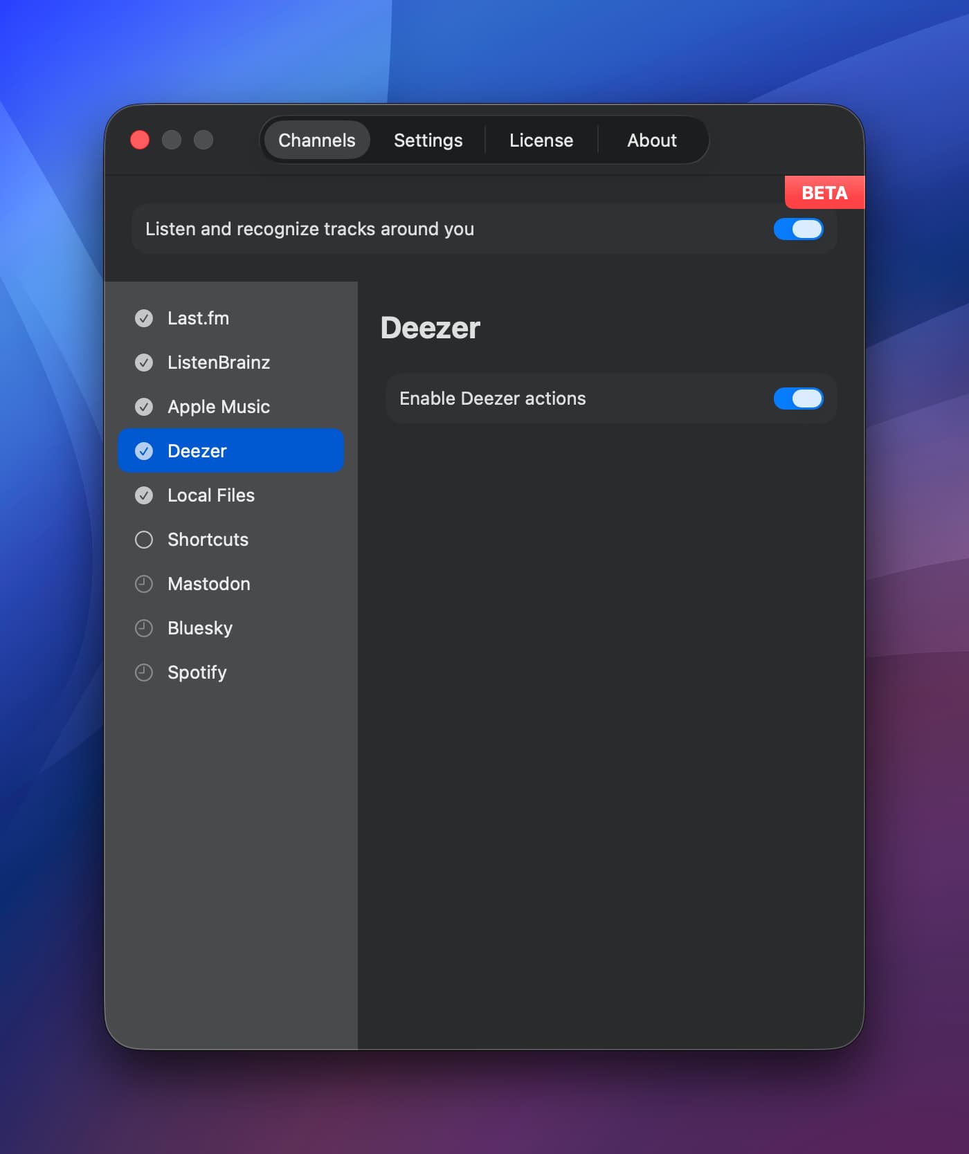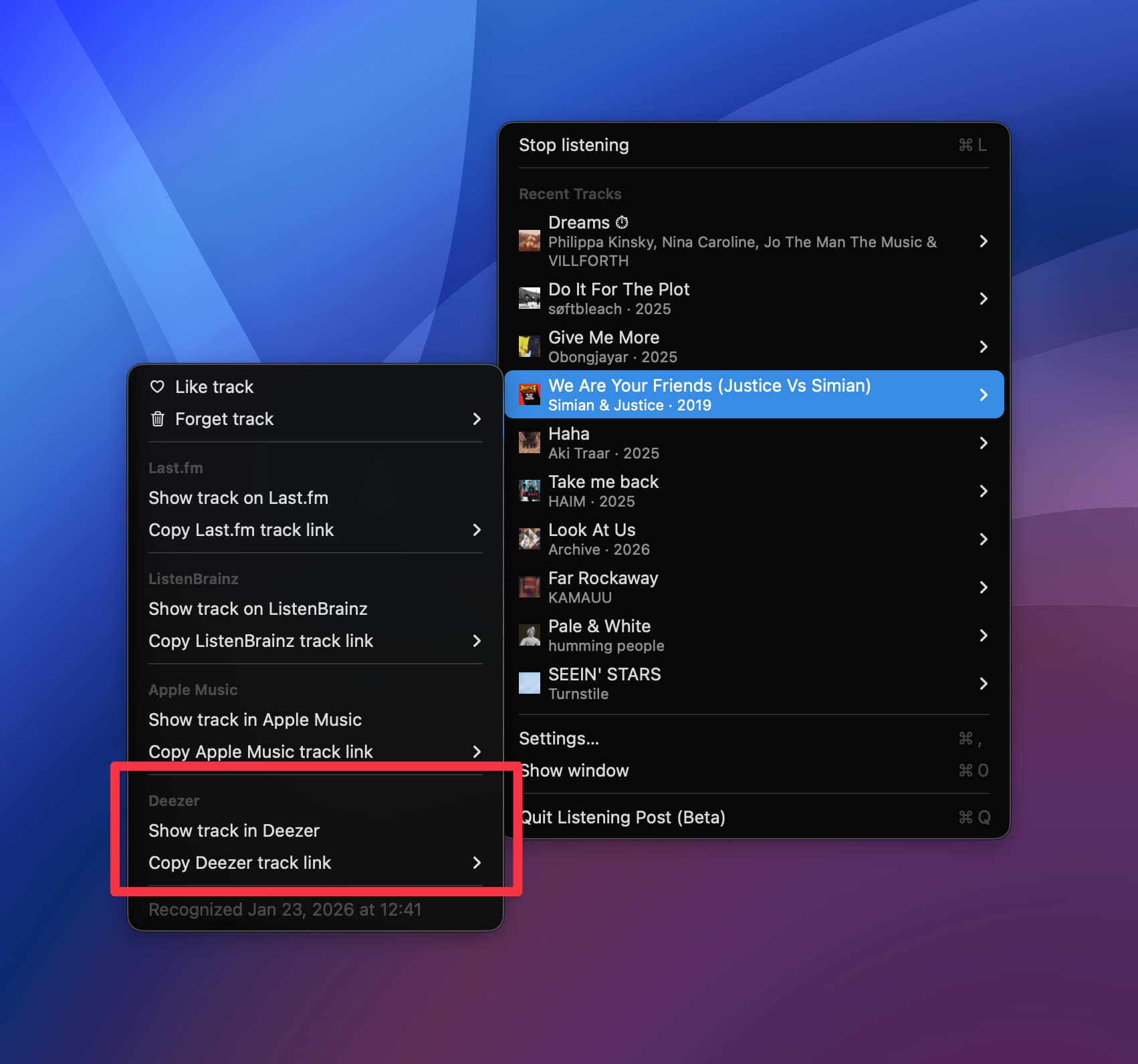 When enabled, recognized tracks get Deezer actions in their menu (if the track exists in the Deezer catalog). That’s it for now. No accounts to connect, no tokens to configure.