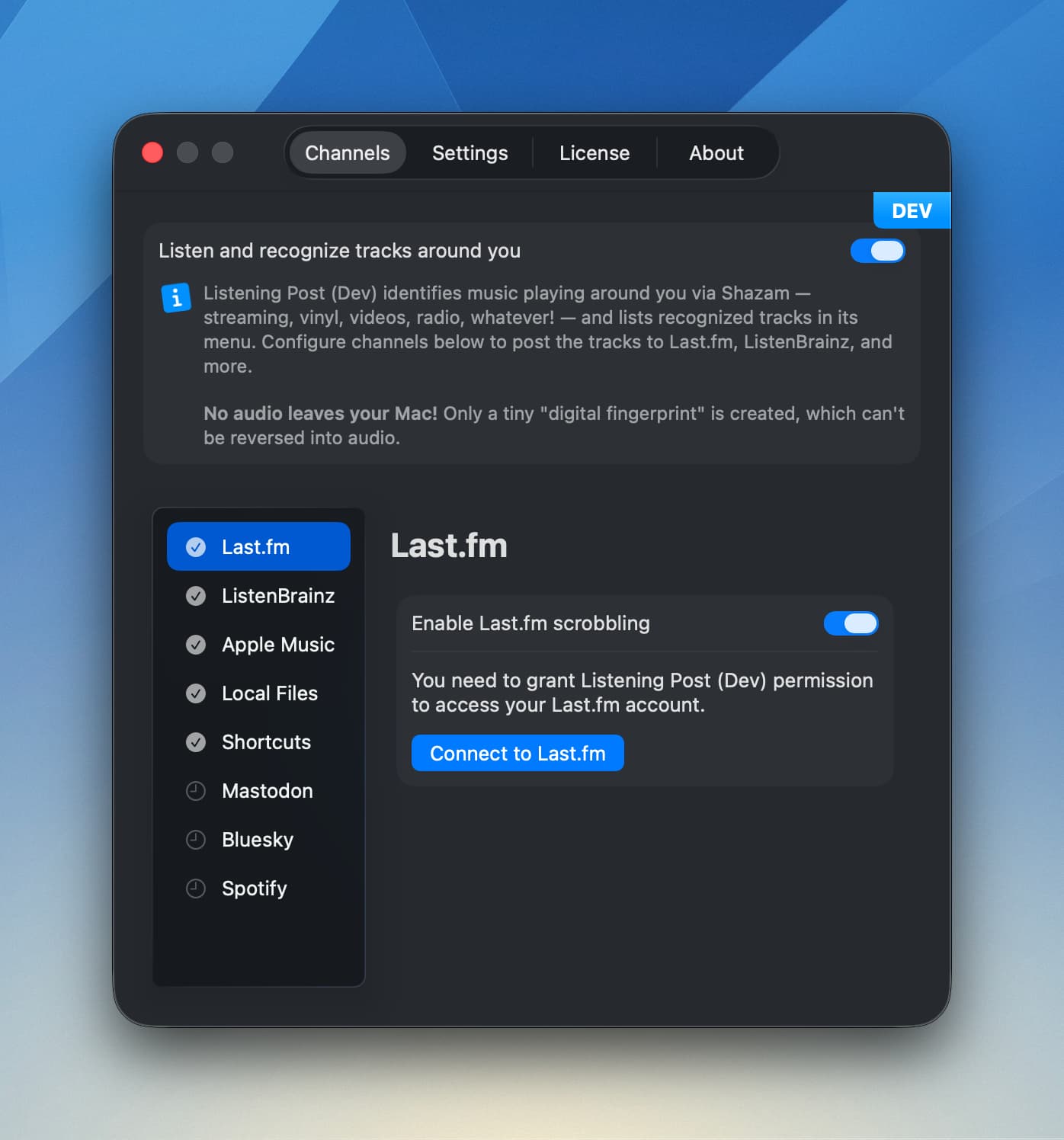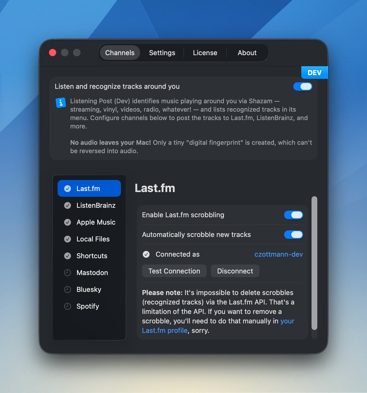 Click the “Connect to Last.fm” button, this will open their site in your browser. There, click the “Yes, allow access” button. The site will show you a green “You have granted permission to Listening Post to use your Last.fm account” notice. Go back to the app, which should now reflect the authorization: