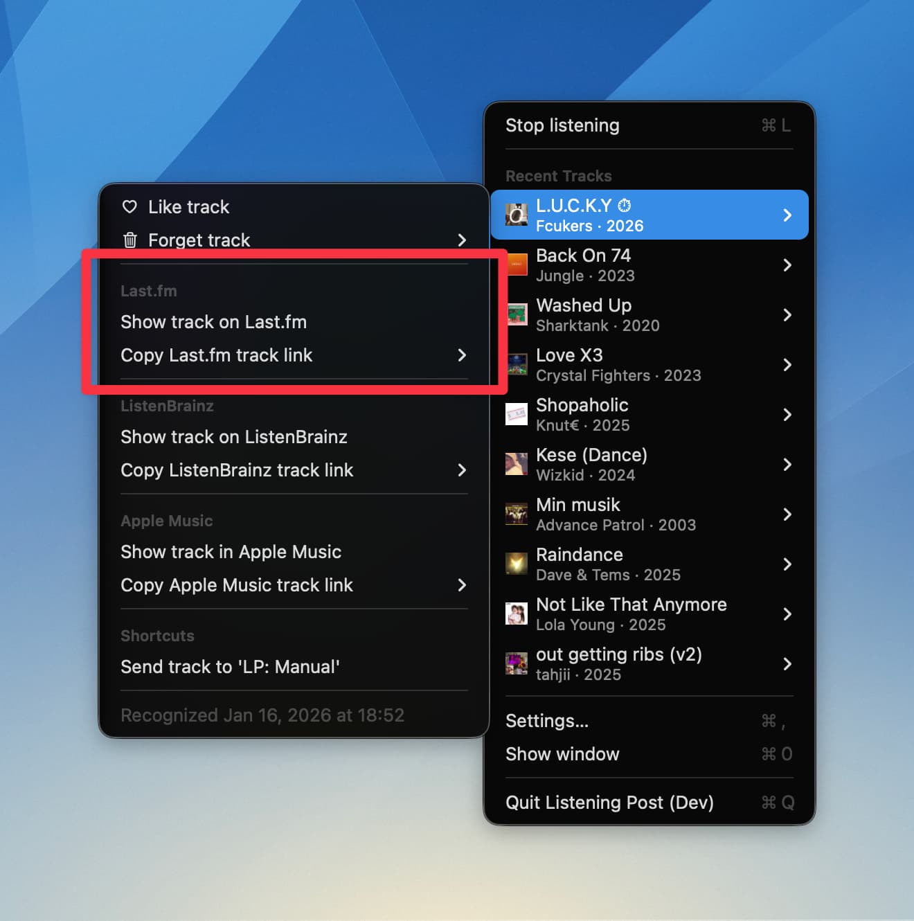 - Copy Last.fm track link: Copies the URL (plain or Markdown-formatted)