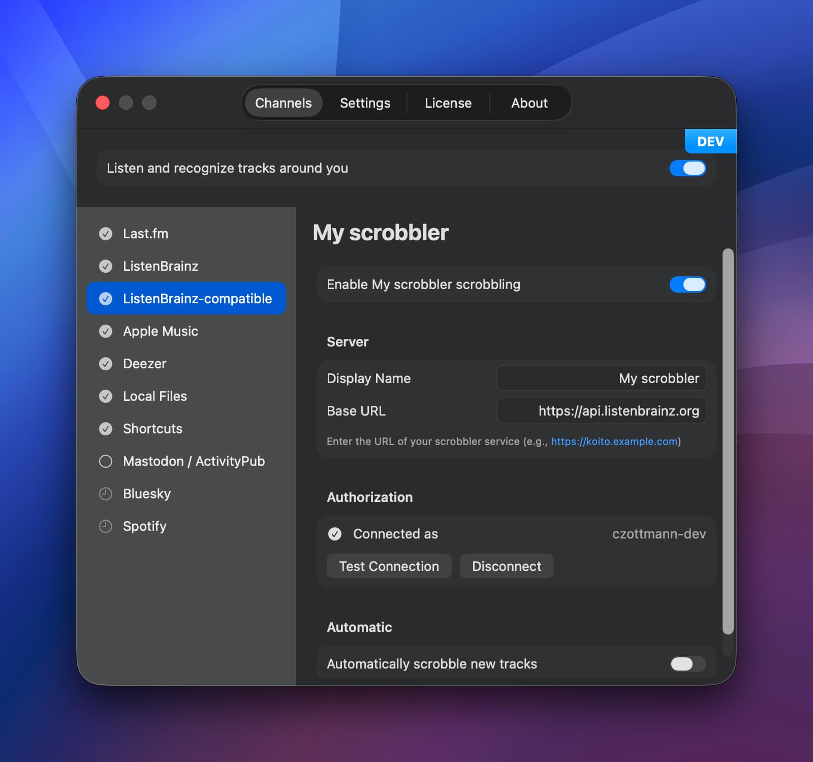 Name your channel here, and specify the base API URL of your scrobbler.