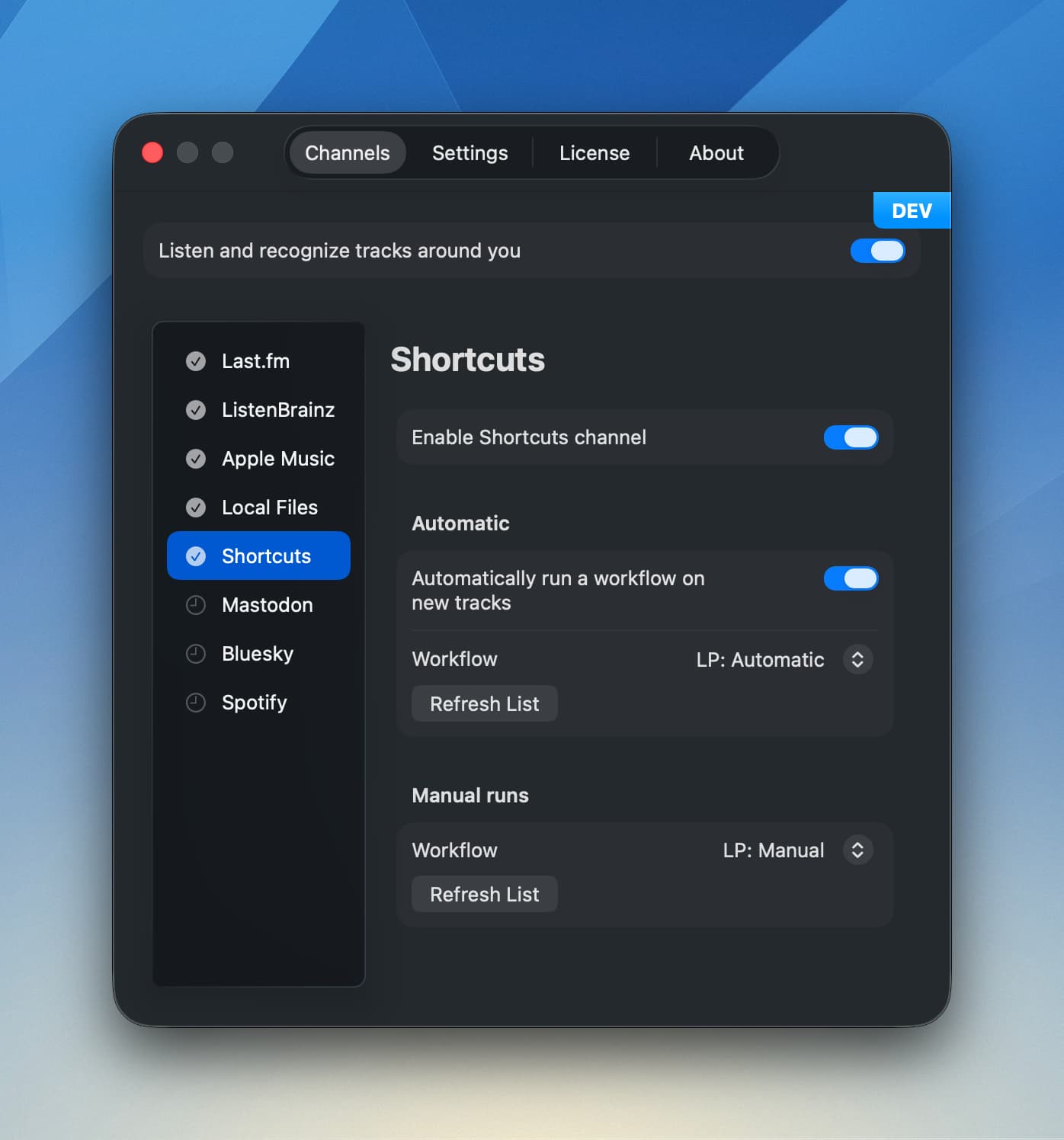 The Shortcuts channel lets you name Shortcuts workflows which will be run either automatically, or manually from the track menu.