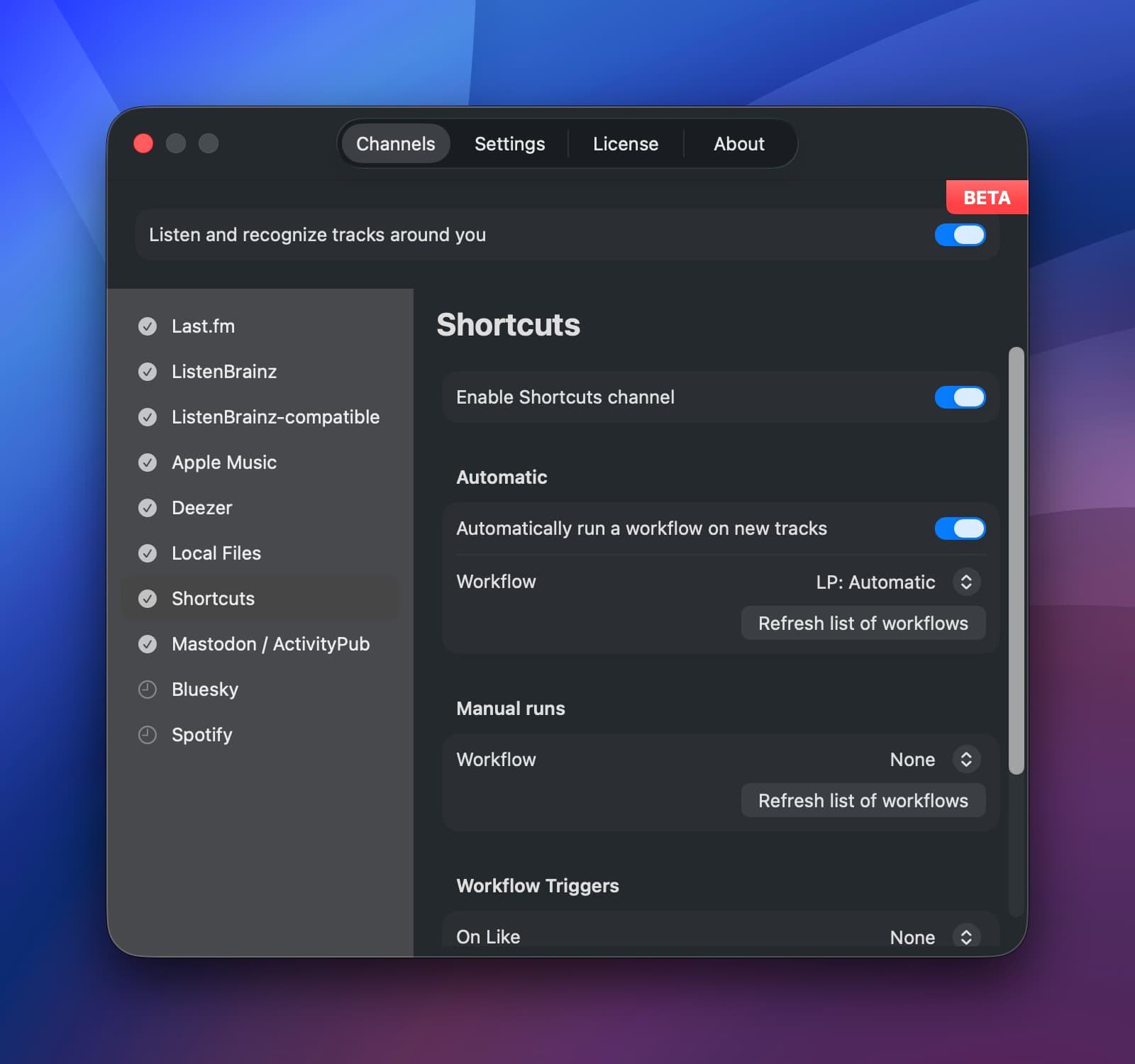 The Shortcuts channel lets you name Shortcuts workflows which will be run automatically, manually from the track menu, or when you like/ unlike/ delete a track.