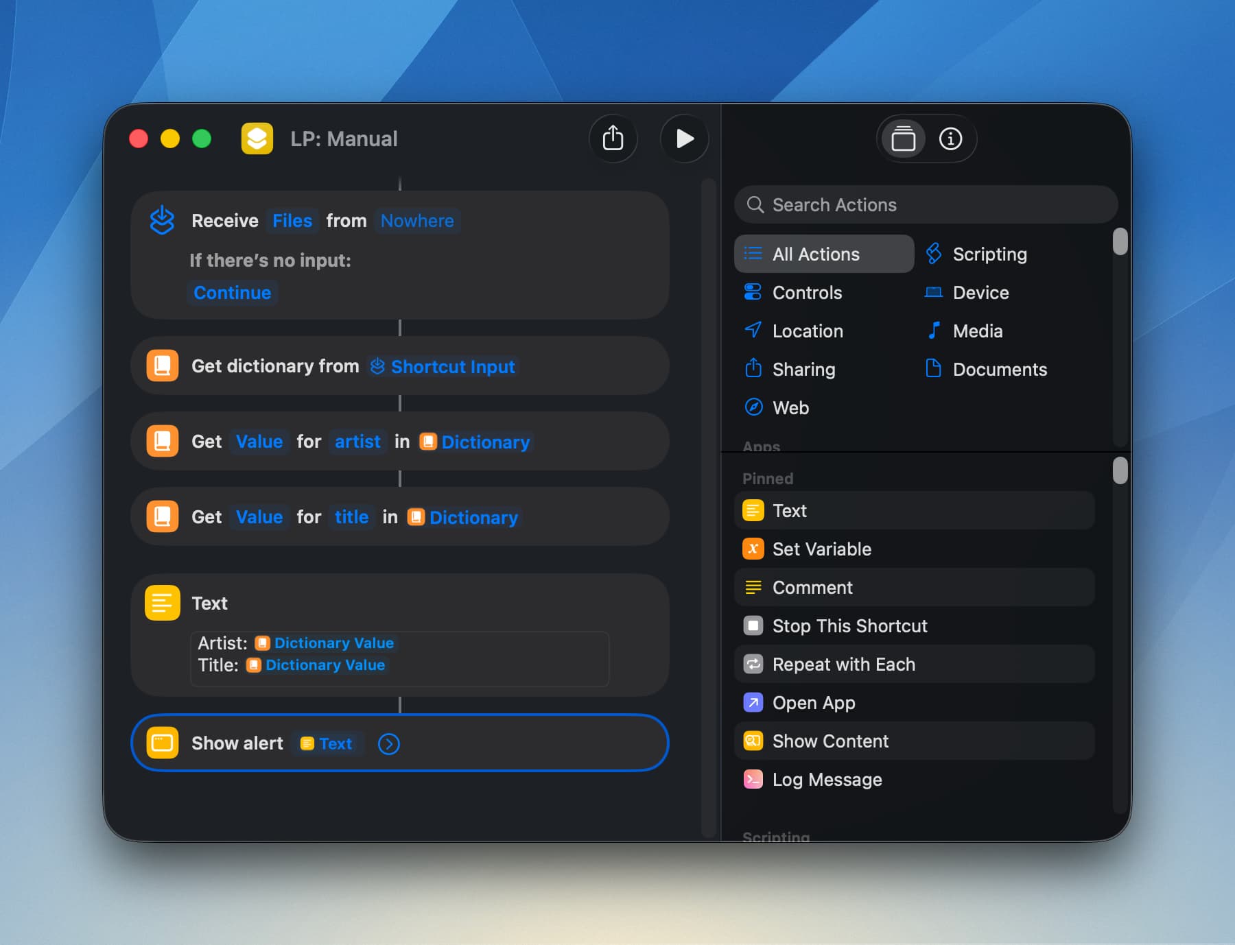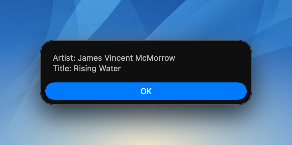 Each of these field/value pairs will become an entry in the dictionary. In the example below, both the “artist” and “title” values are used to build a simple text, which is then shown as an alert: