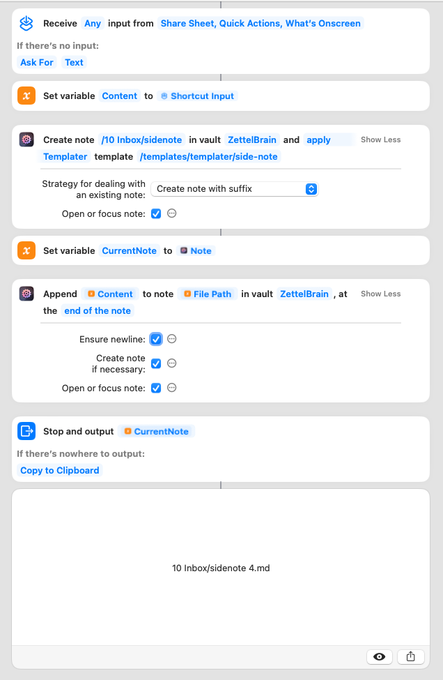 I’d like to be able to share the content from an app I use as a scratch pad to Obsidian. I can share the content of the note from the app to a shortcut but I am struggling to make the shortcut work. I have attached a screenshot of the shortcut. If I run the shortcut without triggering it from a share action it prompts me for some text and it will run ok. I have attached a screenshot of the app with the share menu active to illustrate what I am trying to do I tried to attach a screenshot of the app with the share menu active to illustrate what I am trying to do, but as a first time user I’m not allowed to upload more than one image. Appreciate any help ![]()