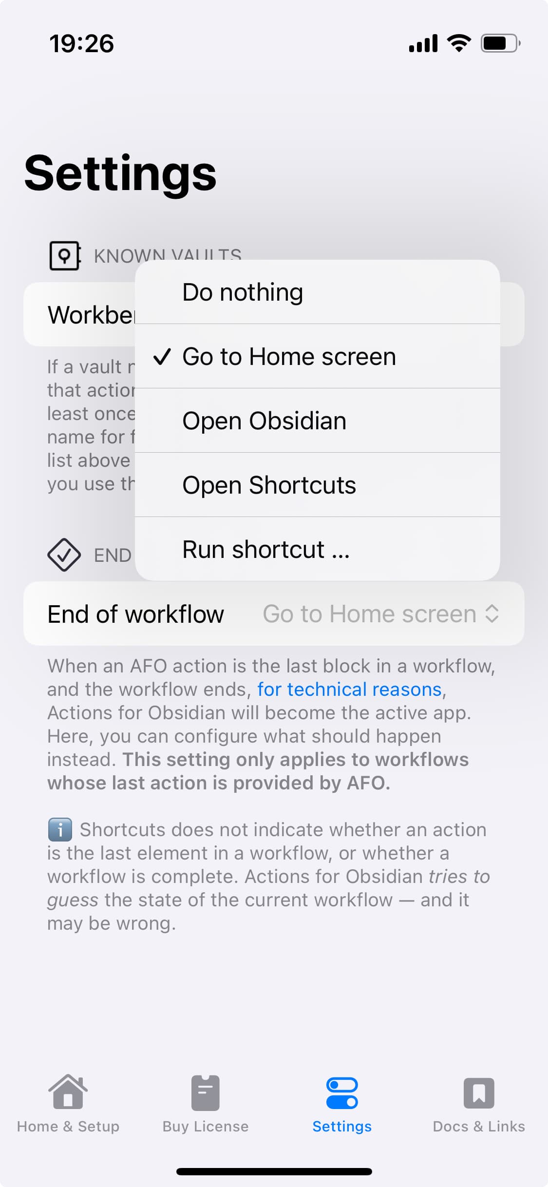 Different people have different ideas of what their workflows should do once it’s done. Maybe a workflow should return to the home screen, maybe it should open the most recently active note in Obsidian, maybe it should start playing a podcast or something.