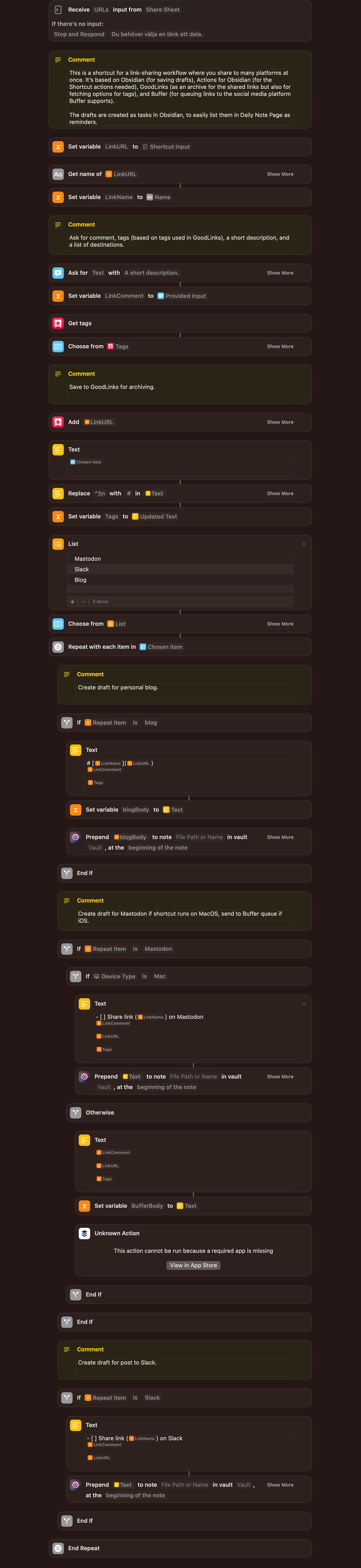 Thereafter, the link is saved to GoodLinks before drafts are created in Obsidian (or, if destinations supported in Buffer are selected and the shortcut is run on iOS, pushed directly to my queues for social media).