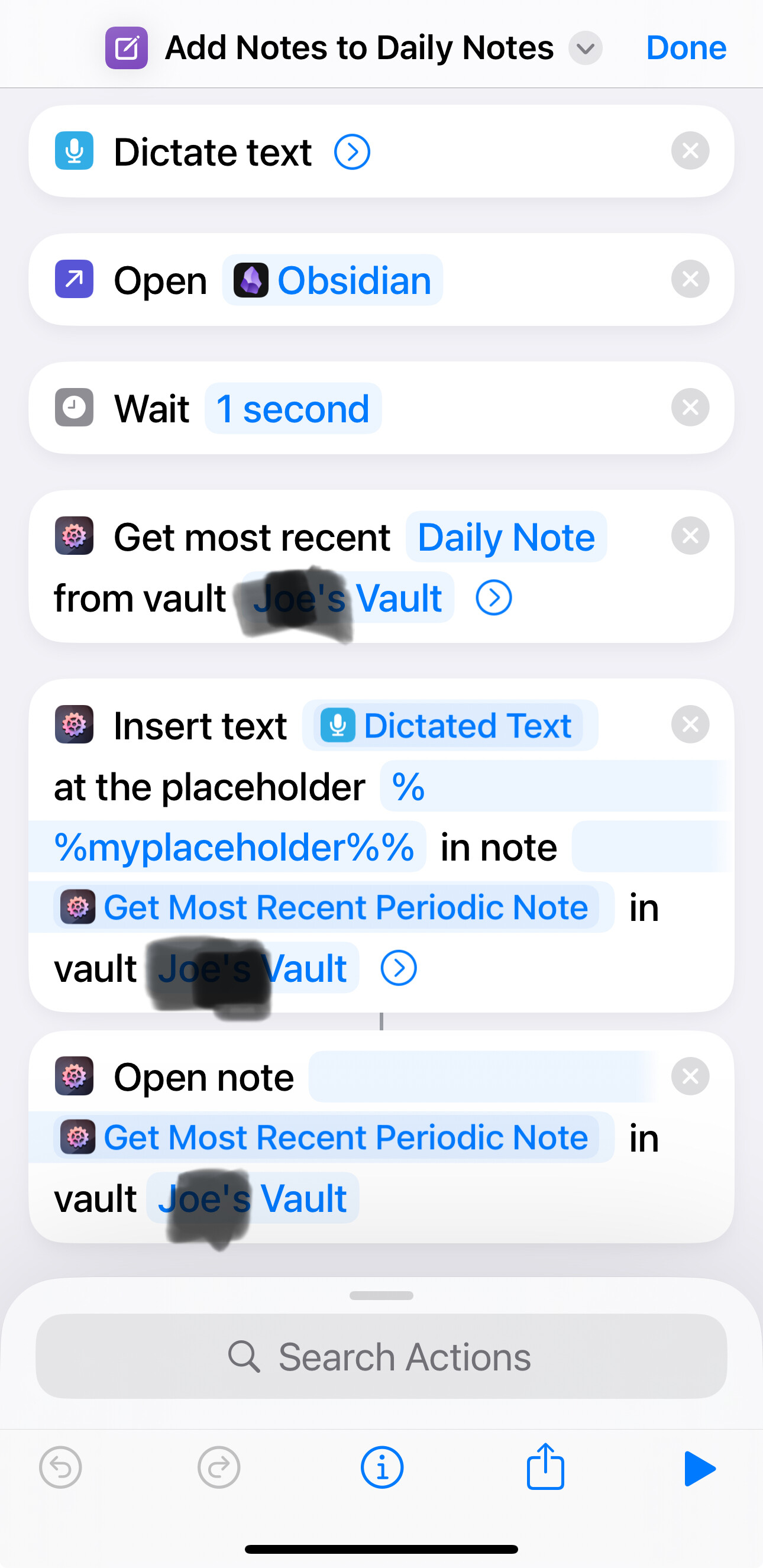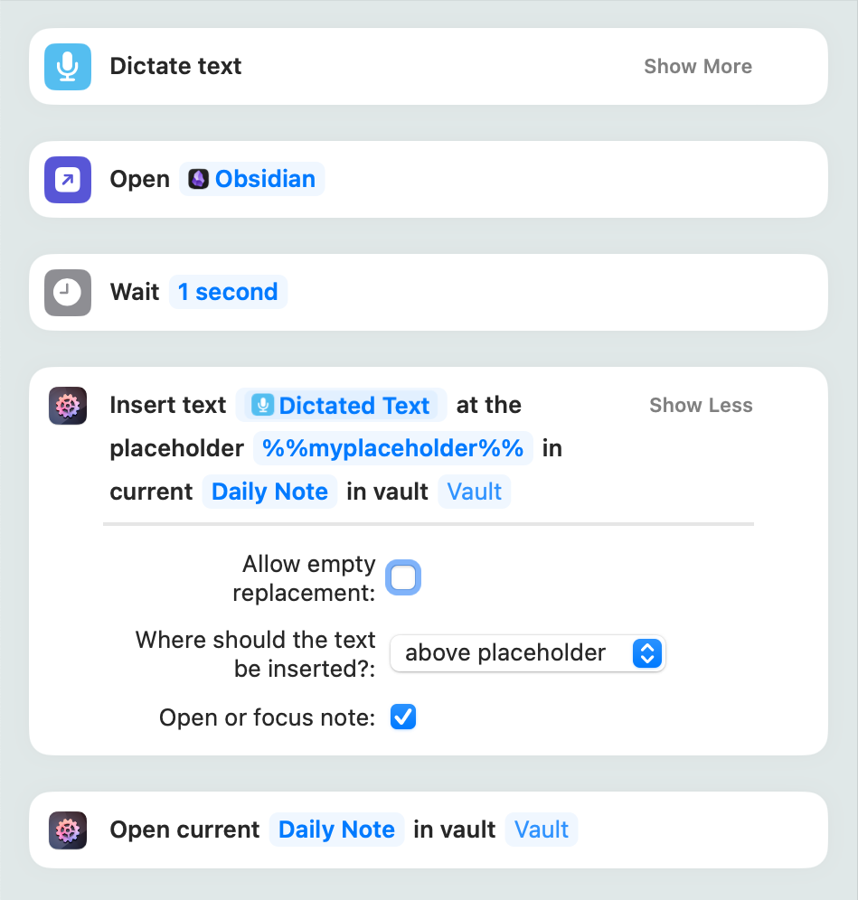 As the shortcut runs, it correctly opens the most recent daily note (so it does “know” the correct file path relative to the vault). But my dictated text is never inserted at the placeholder and instead a dialog appears twisting the file path. The dialog box contains the following