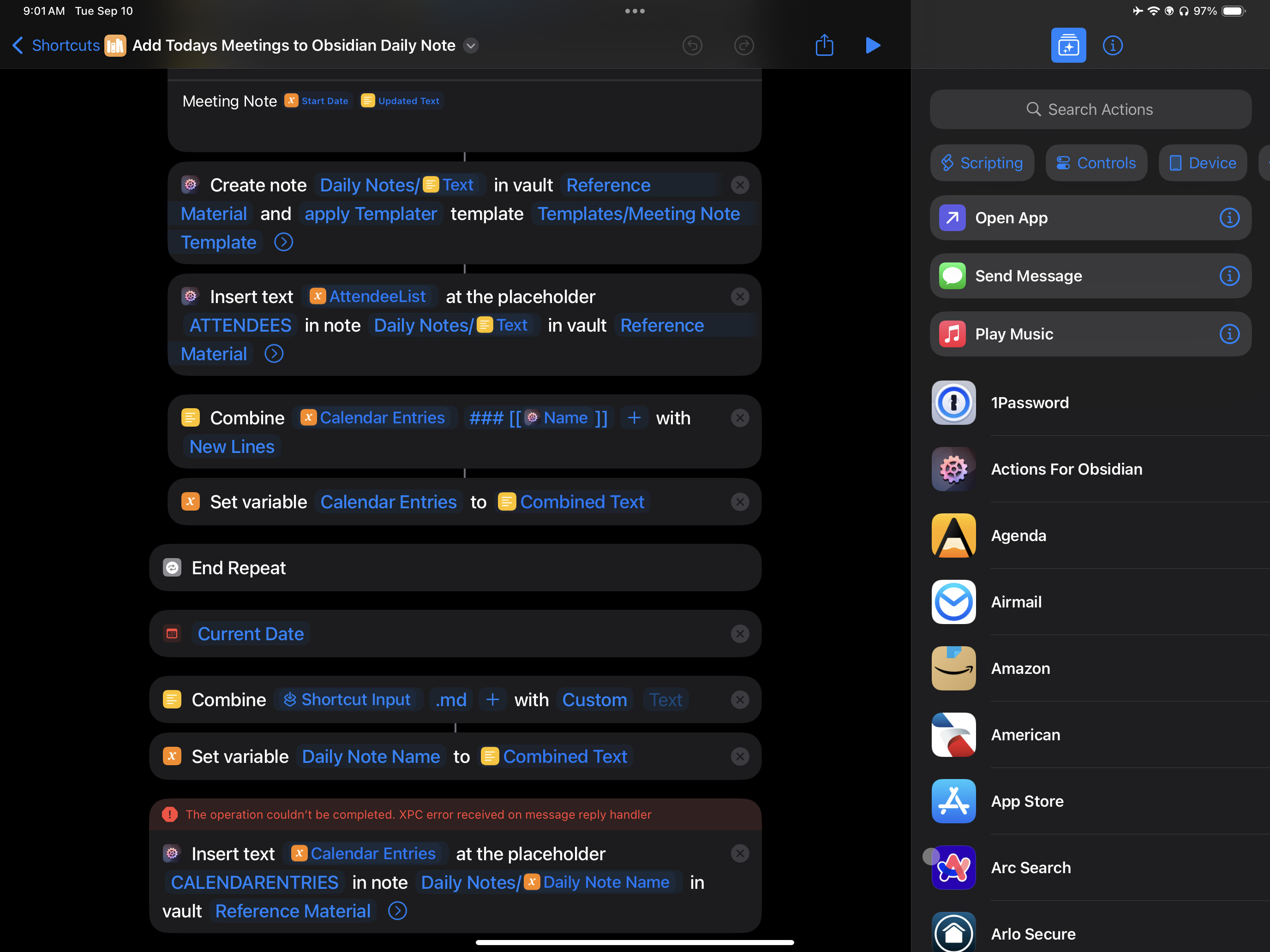 It’d be helpful if you could install my Logstravaganza plugin, enable it, restart Obsidian, then try the failing Shortcuts workflow. After it failed, disable the plugin again, and send me the resulting note via feedback mail so I can take a look.