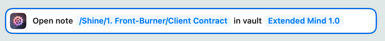 I was able to create and open the note /Shine/1. Front-Burner/Client Contract.md, so maybe there’s an extra space or something in the path, either the path of the actual note or the parameter in the action?