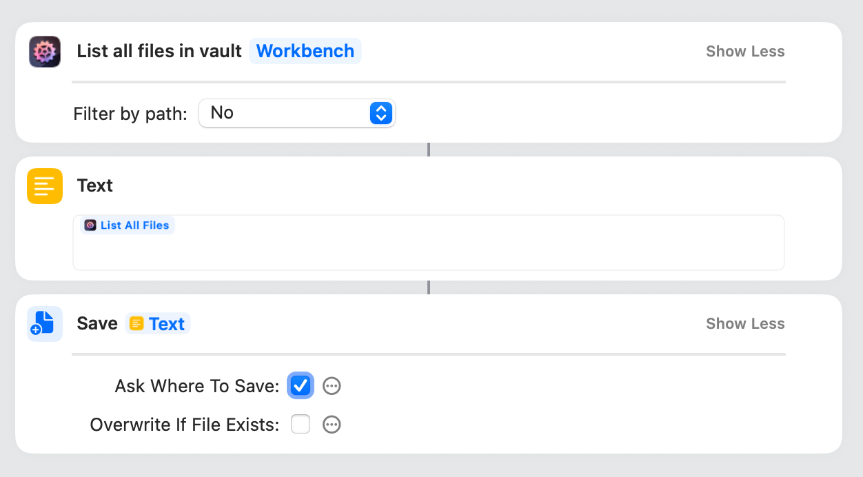 That’s a List All Files action (or anything that returns a list of strings), followed by a native Text action which only contains the output of the first action), followed by a native Save File action that saves the result of the second action.