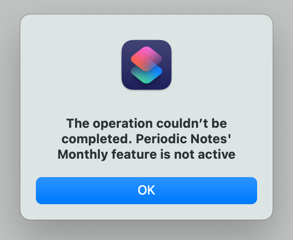 Right now, if you try to use a feature that isn’t enabled in Obsidian, the error message will tell you in plain words. Here’s what’s getting displayed if you try to work with a monthly note when Periodic Notes’ Monthly Notes isn’t enabled (or PN isn’t installed!):