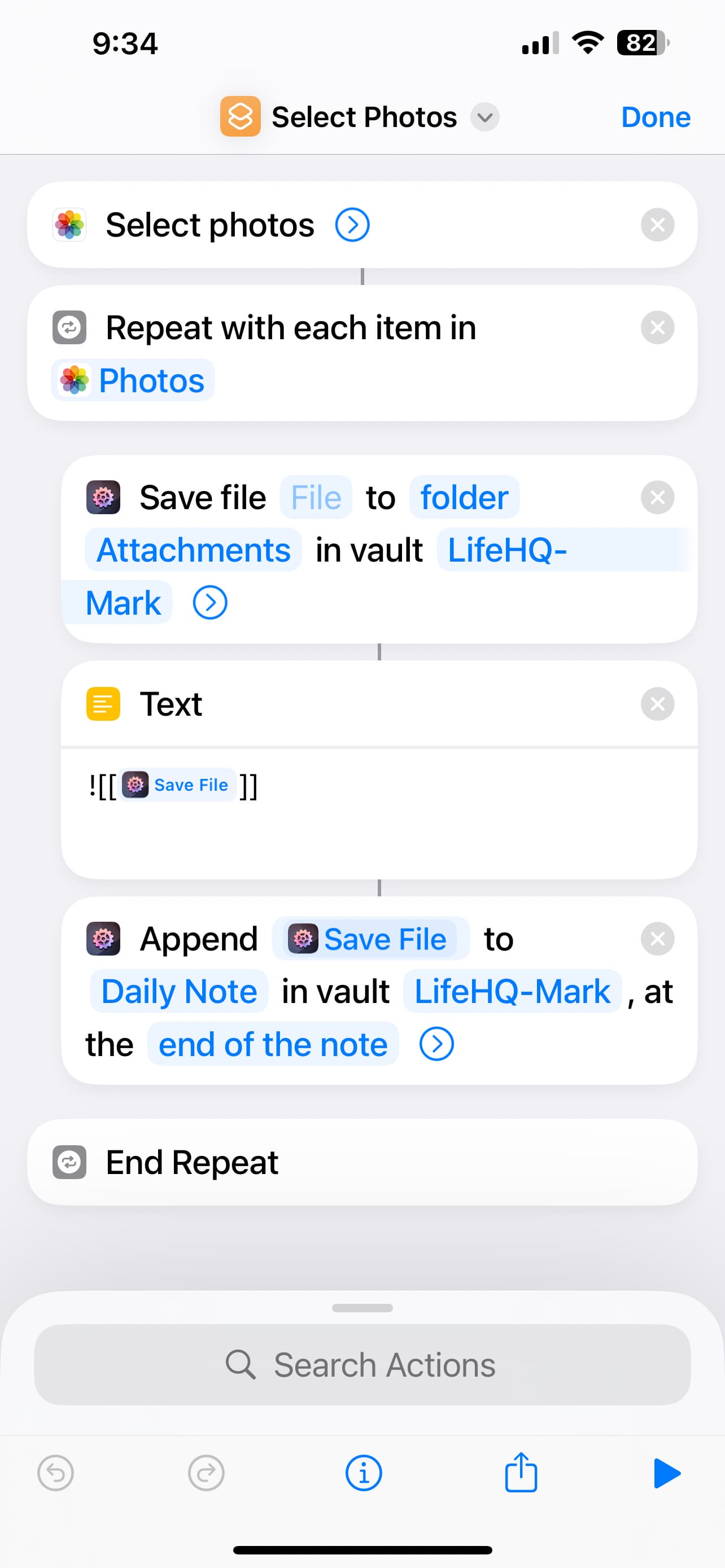 Right, so you’re looping over the list of photos (Repeat with each item in …) one by one. This sets up a Repeat Item variable inside that loop that contains the current photo. The issue is that the the Save File’s File parameter is empty. Long tap that parameter, that should give you a few available options, among them the Repeat Item.