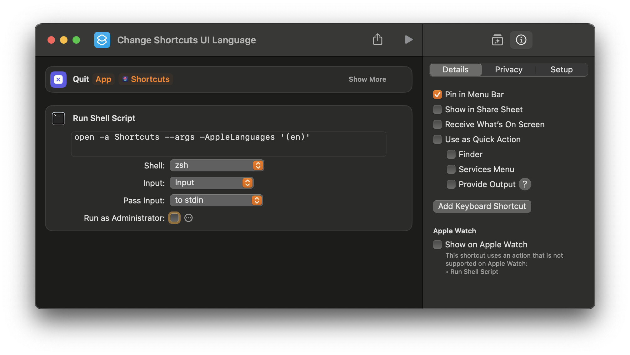 Just three little things. The name of the application in the “Quit App” action is in the current language of the shortcut application, for the shell command it’s always the English name. Second, this shortcut won’t work when using the Run button in the Shortcuts app itself, but the Run button works with all other apps. Third, the language will revert to the default when you quit the application.