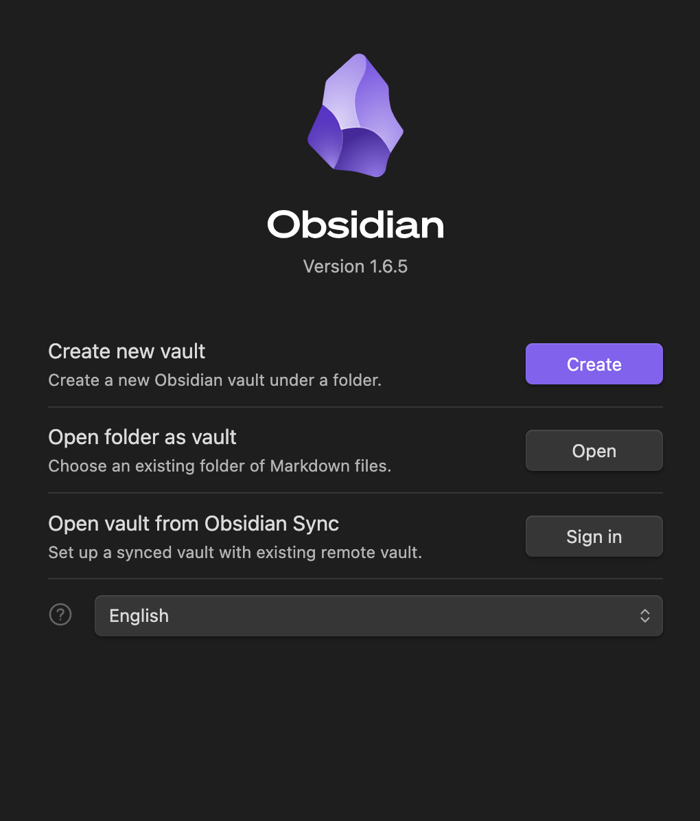 Obsidian comes to the foreground, and half a second later the vault chooser screen appears: