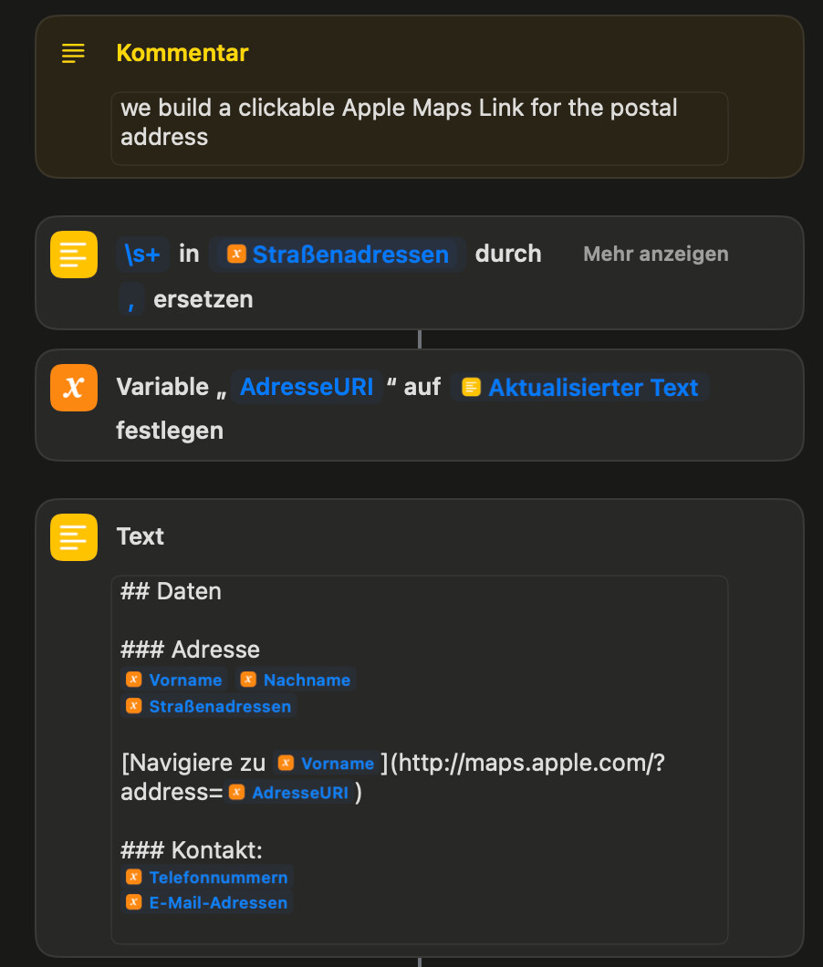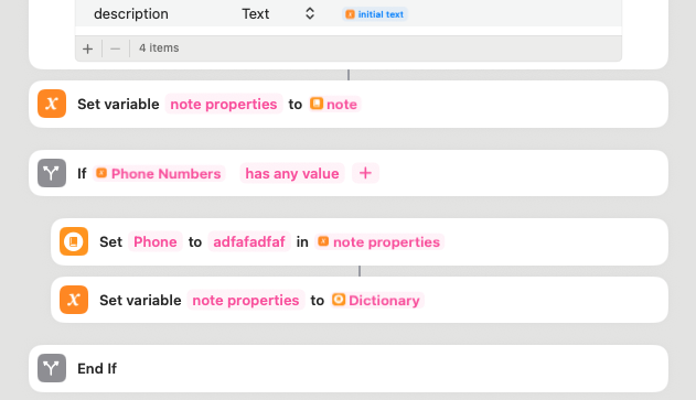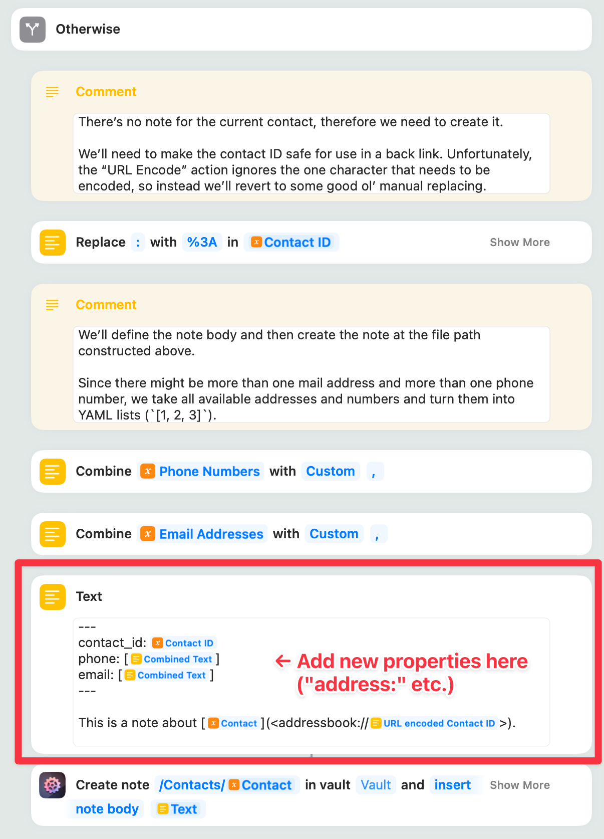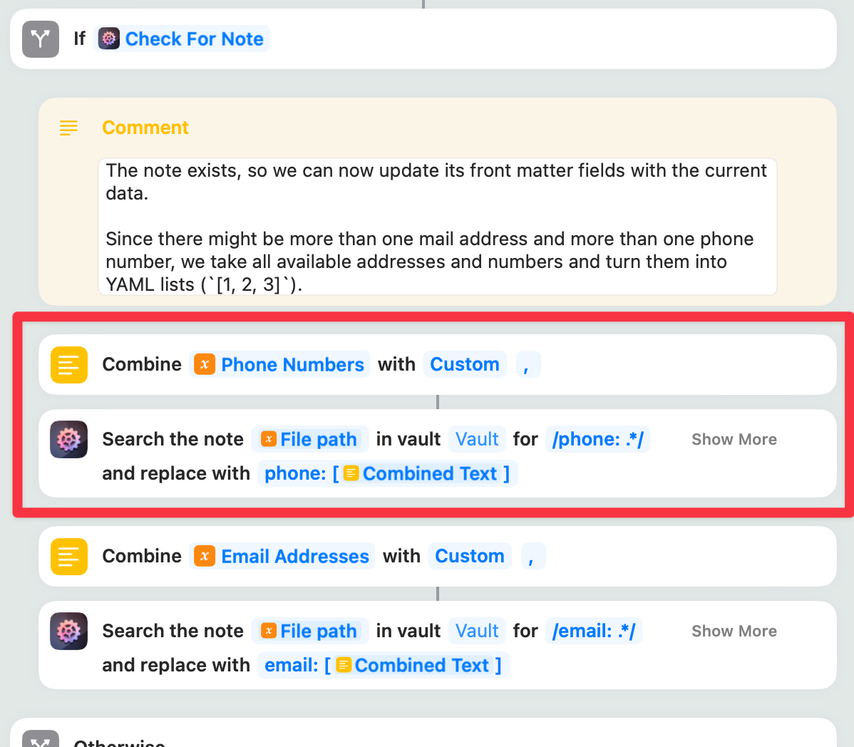 And two, the workflow above extracts all phone numbers and email addresses from the contact but doesn’t retain their metadata (“home”, “work”, etc.), so to sync changes made to these values/properties in the Obsidian note it’d become necessary to store that metadata along the value as well so the correct address book entry can be updated.