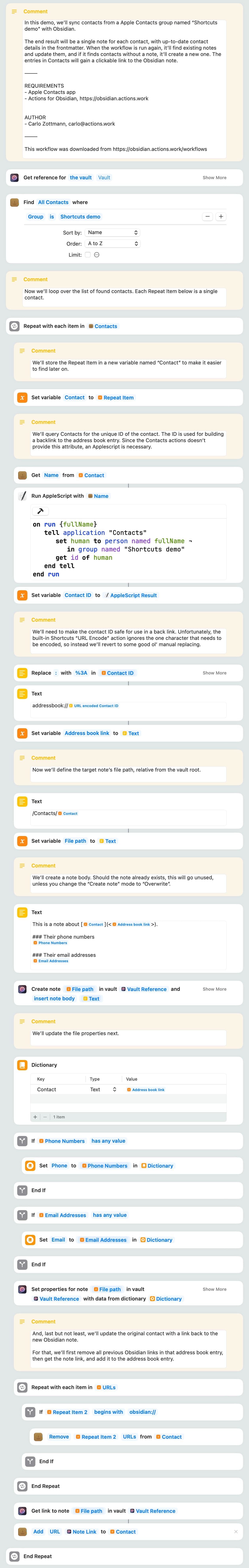 It syncs contacts from a Apple Contacts group named “Shortcuts demo” with Obsidian.