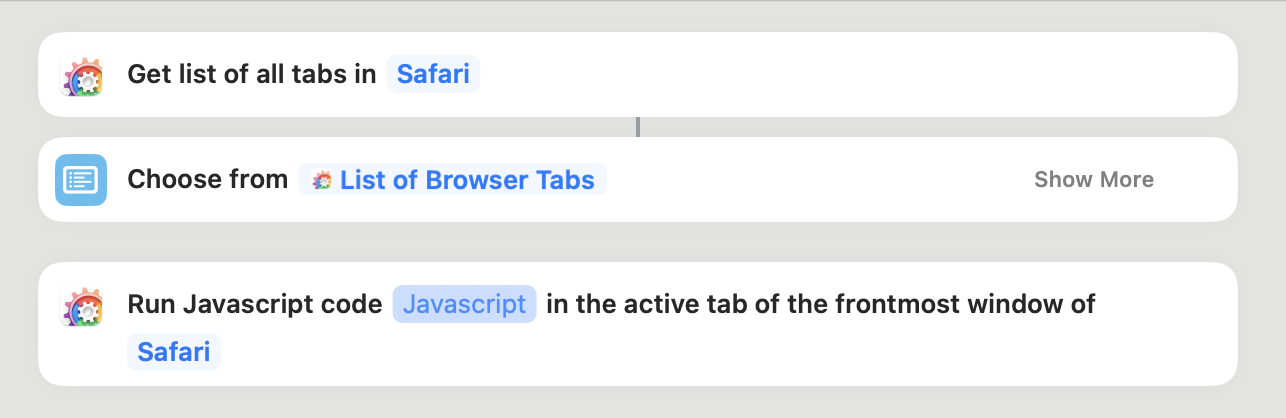 For this alpha build, the app only comes with a handful of actions. I’ve concentrated on the basics here, and worked my way “from the outside in”, i.e. I started with actions for working with browser windows, then browser tabs, then web pages. This is not the final list of actions.