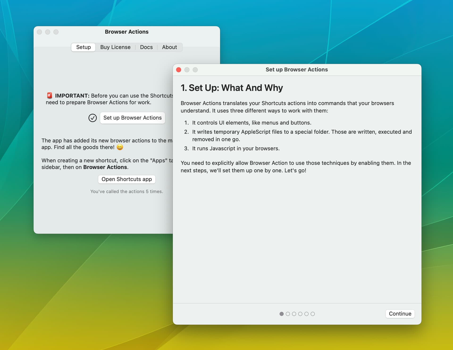 When you start the app, you’ll see the prominent “Set up Browser Actions” button. Clicking it will open the onboarding wizard, please go through it, otherwise the actions won’t work.