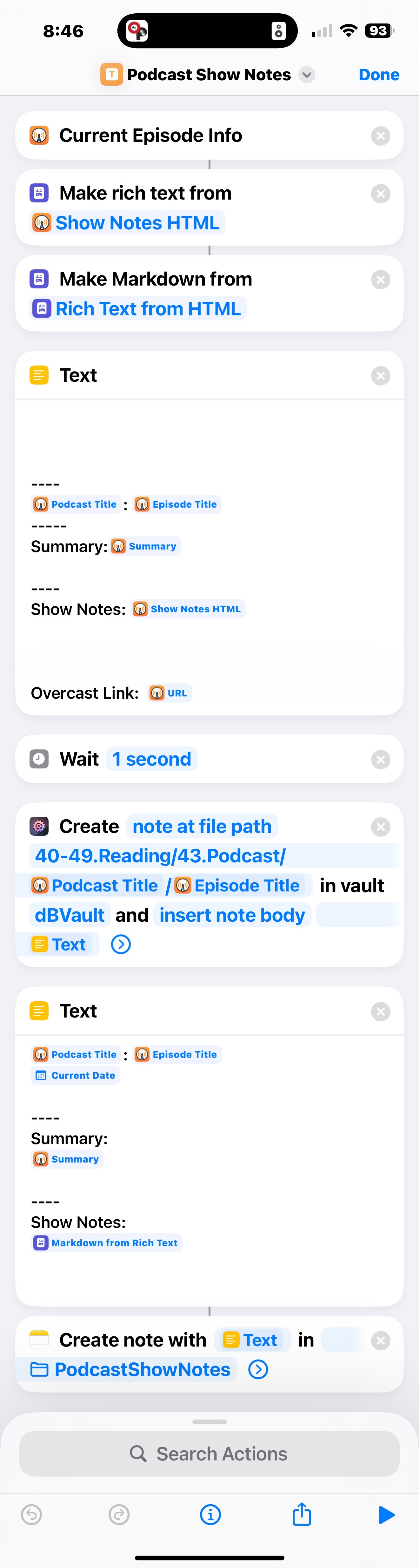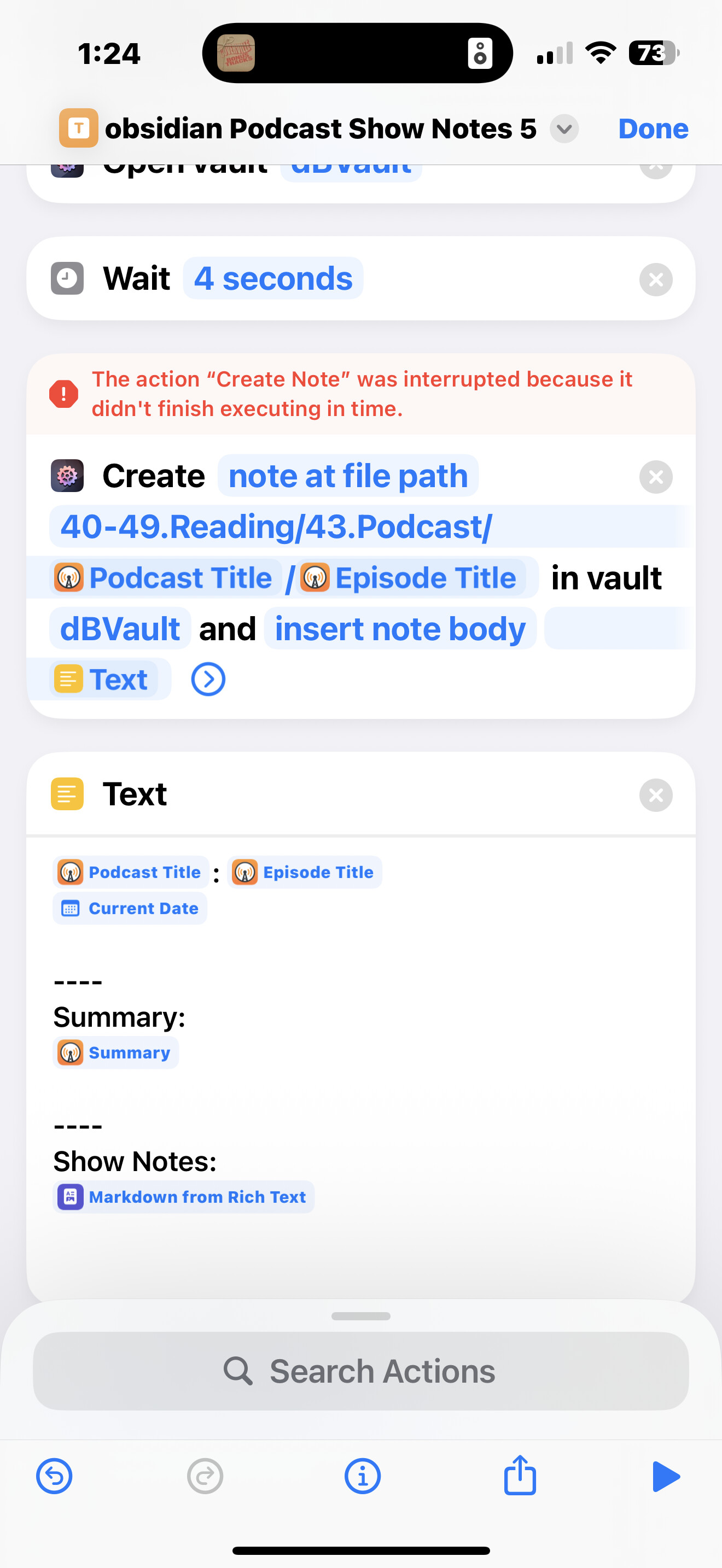 I’ve got a shortcut to save podcast show notes that’s been running for months w/o a problem, and all of a sudden, it’s been hanging at the Create a note action. The paths’ in my vault haven’t changed, and my podcast app seems to be returning the same information. Has something with Actions changed recently?