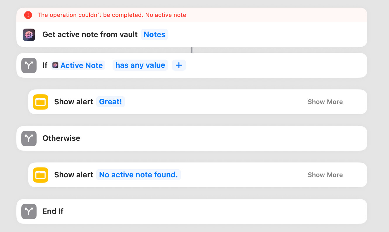 According to the documentation, the action “Get Active Note” should return a boolean that can be passed over to an if. But if Obsidian’s open with no tab focused on any note, Shortcuts raises an error instead.