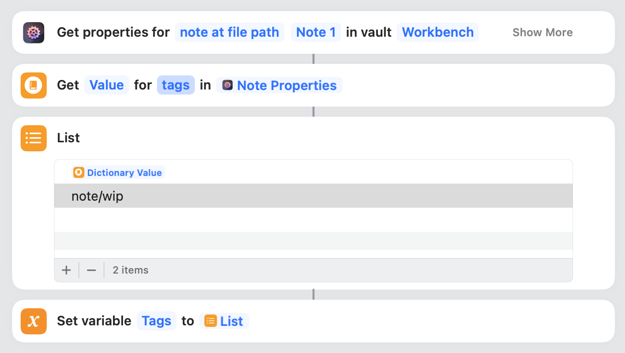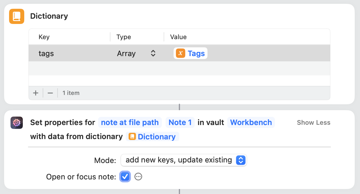 I have gotten tangled up trying to update Dictionary variables between the notes, but that hasn’t worked out. Also, I tried to Set Properties after Create Note in the target vault, but that didn’t work either. For now, I have to manually update the tags in both notes so they’re what I want using the Dataview query view notes. Obviously, I would prefer to automate updating the tags to reflect workflow processing. Any suggestions to get me unstuck?