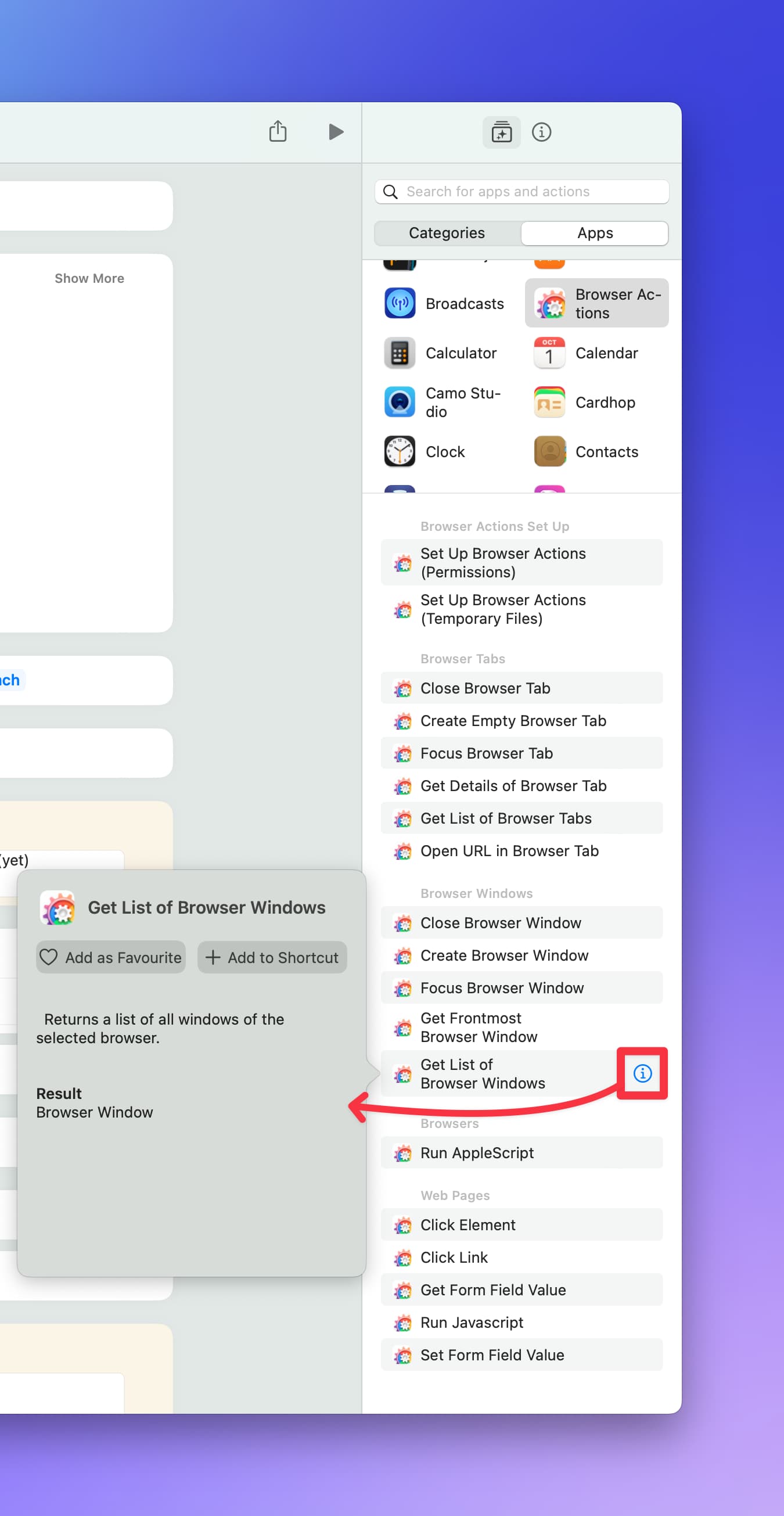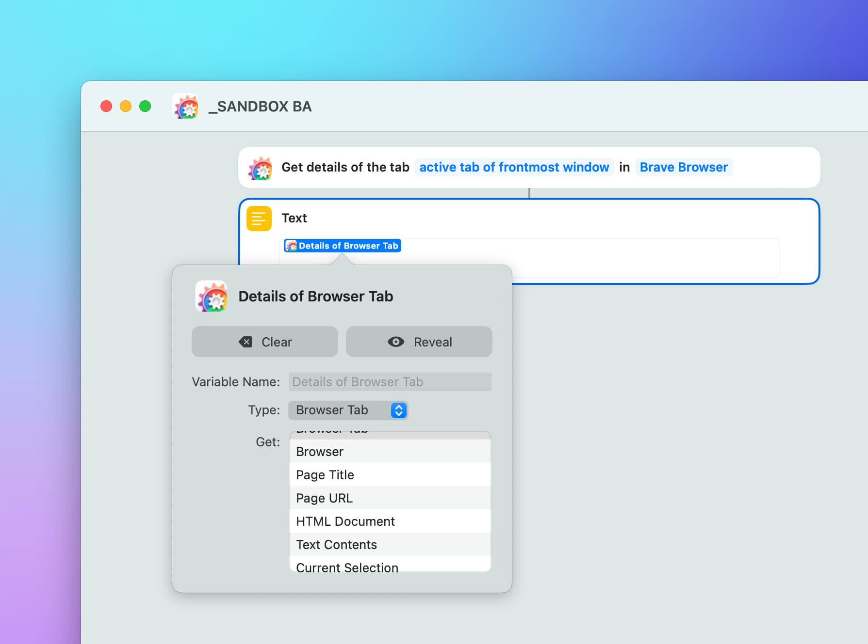 The “Browser Windows” and “Browser Tabs” actions return data representations of windows and tabs, respectively. Both contain a number of properties that you can select when working with the result: